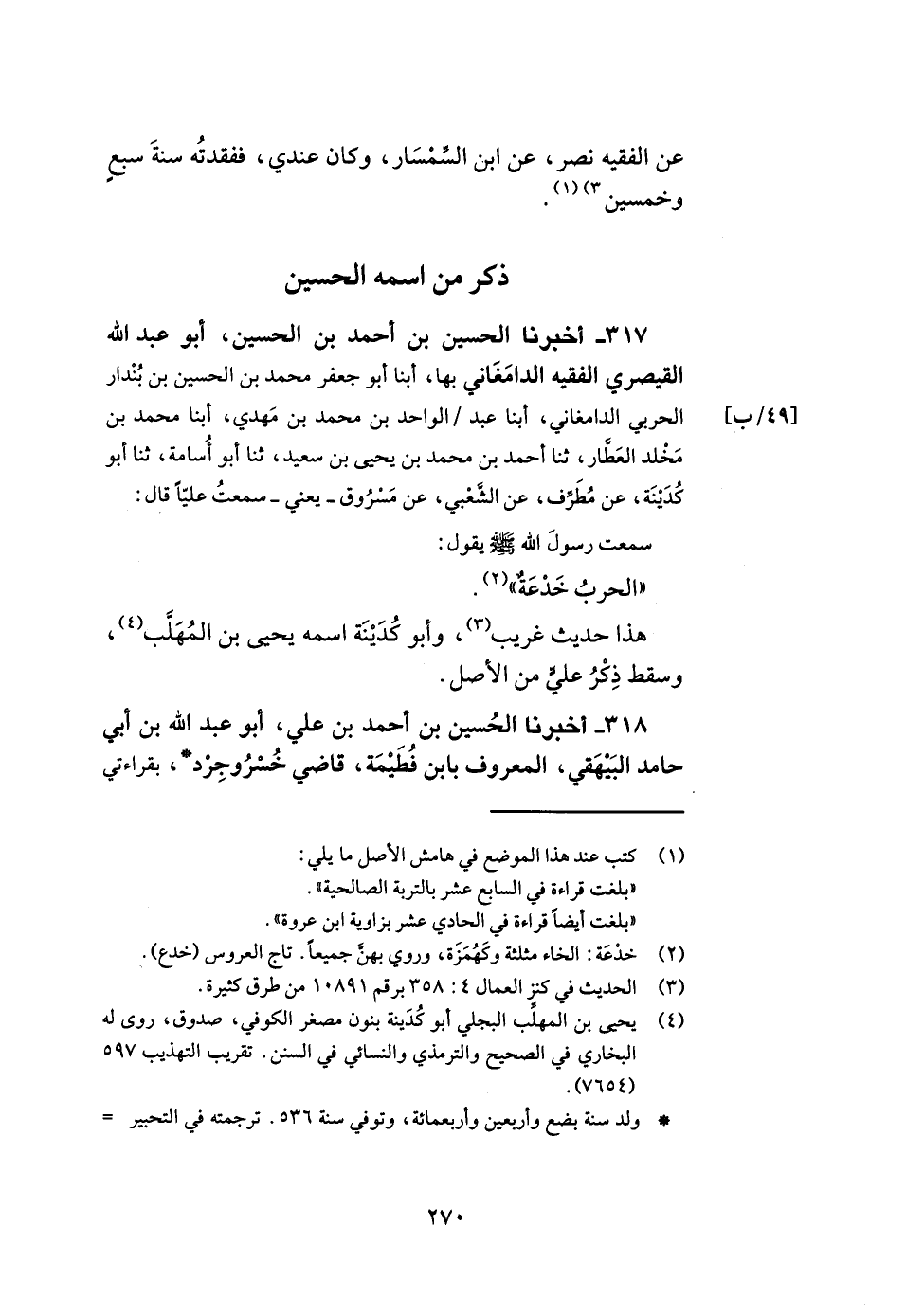 317- أخبرنا الحسين بن أحمد بن الحسين أبو عبد الله القيصري الفقيه الدامغاني بها أبنا أبو جعفر محمد بن الحسين بن بندار الحربي الدامغاني أبنا عبد الواحد بن محمد بن مهدي أبنا محمد بن مخلد العطار ثنا أحمد بن محمد بن يحيى بن سعيد ثنا أبو أسامة ثنا أبو كدينة عن مطرف عن الشعبي عن مسروق يعني سمعت عليا قال سمعت رسول الله صلى الله عليه وسلم يقول الحرب خدعة.