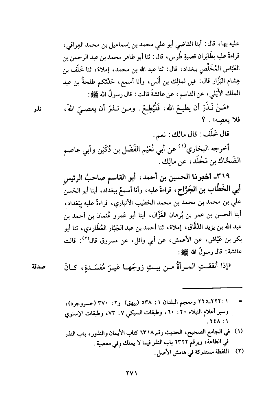 319- أخبرنا الحسين بن أحمد أبو القاسم صاحب الرئيس أبي الخطاب بن الجراح قراءة عليه وأنا أسمع ببغداد أبنا أبو الحسن علي بن محمد بن محمد بن محمد الخطيب الأنباري قراءة عليه ببغداد أبنا الحسن بن عمر بن برهان الغزال أبنا أبو عمرو عثمان بن أحمد بن عبد الله بن يزيد الدقاق إملاء ثنا أحمد بن عبد الجبار العطاردي ثنا أبو بكر بن عياش عن الأعمش عن أبي وائل عن مسروق قال قالت عائشة قال رسول الله صلى الله عليه وسلم إذا أنفقت المرأة من بيت زوجها غير مفسدة كان -[272]- لها أجره وللزوج مثل ذلك في اكتسابه وللخازن مثل ذلك.