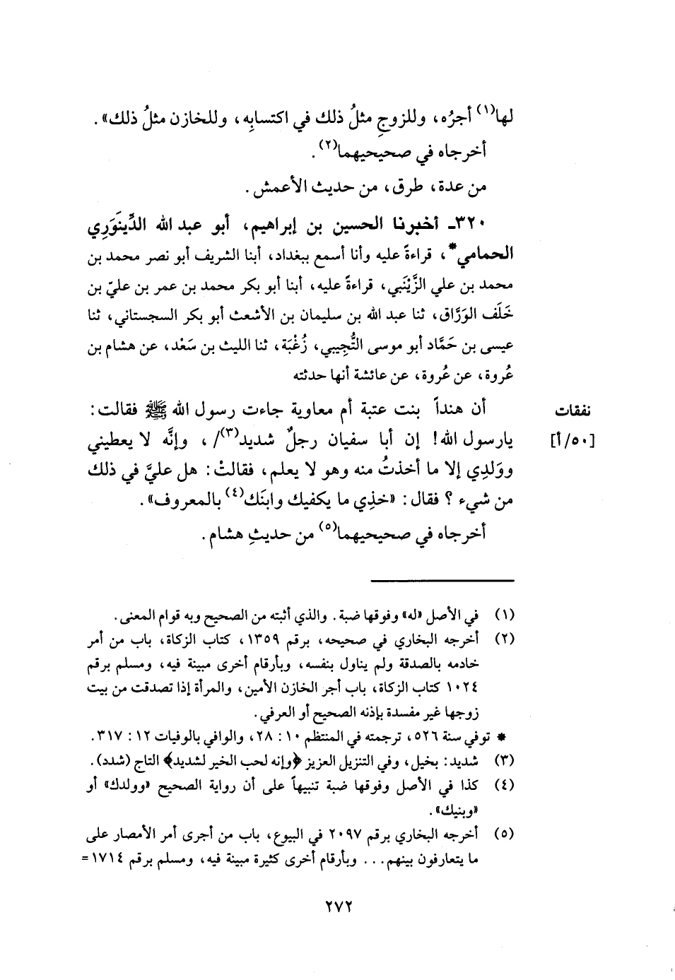 320- أخبرنا الحسين بن إبراهيم أبو عبد الله الدينوري الحمامي قراءة عليه وأنا أسمع ببغداد أبنا الشريف أبو نصر محمد بن محمد بن علي الزينبي قراءة عليه أبنا أبو بكر محمد بن عمر بن علي بن خلف الوراق ثنا عبد الله بن سليمان بن الأشعث أبو بكر السجستاني ثنا عيسى بن حماد أبو موسى التجيبي زغبة ثنا الليث بن سعد عن هشام بن عروة عن عروة عن عائشة أنها حدثته أن هندا بنت عتبة أم معاوية جاءت رسول الله صلى الله عليه وسلم فقالت يا رسول الله إن أبا سفيان رجل شديد وإنه لا يعطيني وولدي إلا ما أخذت منه وهو لا يعلم فقالت هل علي في ذلك من شيء فقال خذي ما يكفيك وابنك بالمعروف.