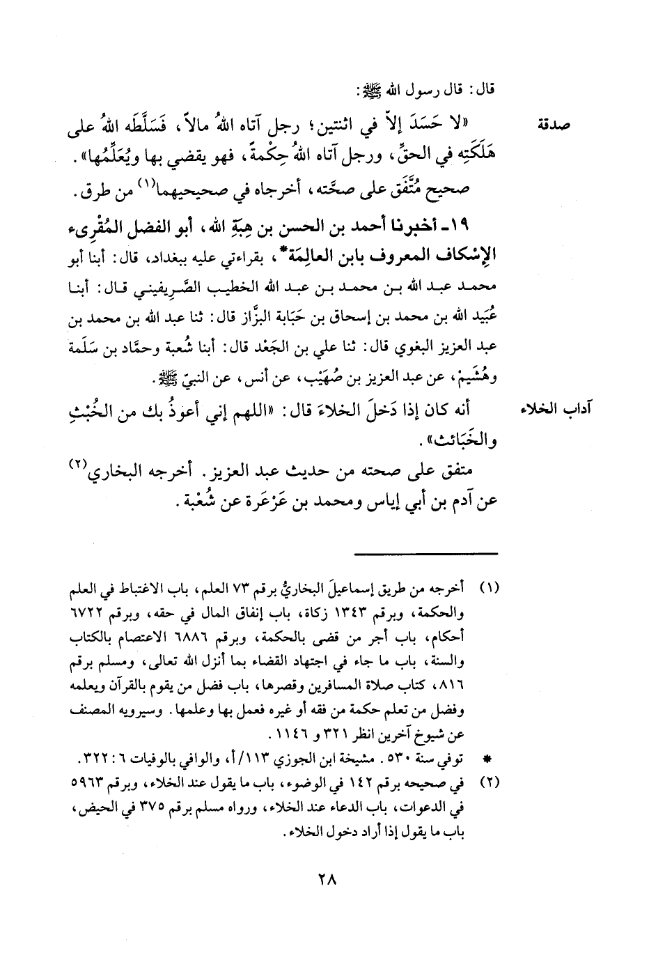 19- أخبرنا أحمد بن الحسن بن هبة الله أبو الفضل المقرئ الإسكاف المعروف بابن العالمة بقراءتي عليه ببغداد قال أبنا أبو محمد عبد الله بن محمد بن عبد الله الخطيب الصريفيني قال أبنا عبيد الله بن محمد بن إسحاق بن حبابة البزاز قال ثنا عبد الله بن محمد بن عبد العزيز البغوي قال ثنا علي بن الجعد قال أبنا شعبة وحماد بن سلمة وهشيم عن عبد العزيز بن صهيب عن أنس عن النبي صلى الله عليه وسلم أنه كان إذا دخل الخلاء قال اللهم إني أعوذ بك من الخبث والخبائث.