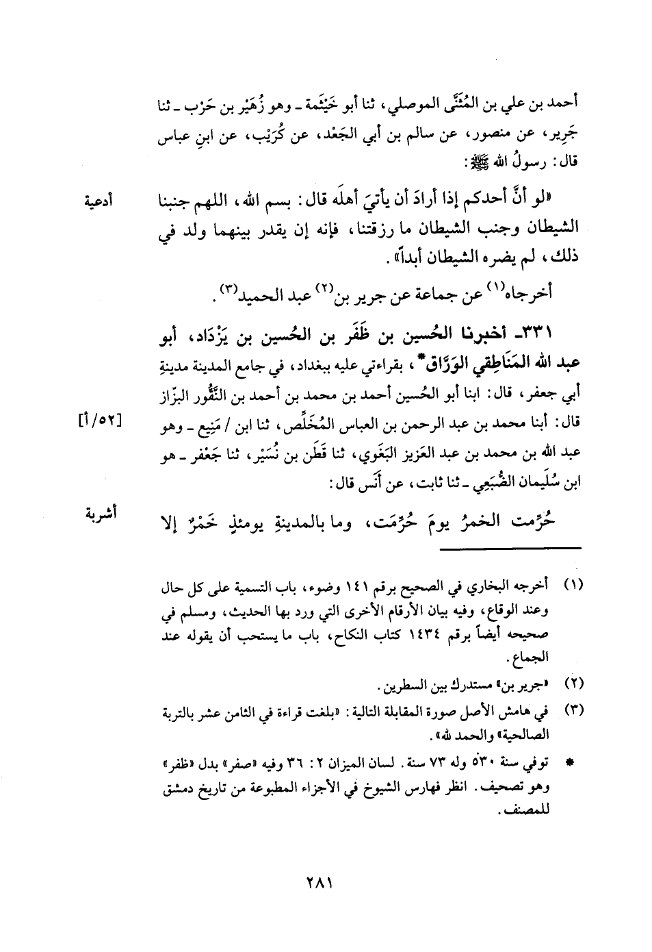 331- أخبرنا الحسين بن ظفر بن الحسين بن يزداد أبو عبد الله المناطقي الوراق بقراءتي عليه ببغداد في جامع المدينة مدينة أبي جعفر قال أبنا أبو الحسين أحمد بن محمد بن أحمد بن النقور البزاز قال أبنا محمد بن عبد الرحمن بن العباس المخلص ثنا ابن منيع وهو عبد الله بن محمد بن عبد العزيز البغوي ثنا قطن بن نسير ثنا جعفر هو ابن سليمان الضبعي ثنا ثابت عن أنس قال حرمت الخمر يوم حرمت وما بالمدينة يومئذ خمر إلا -[282]- الفضيخ فمر مار من عند رسول الله صلى الله عليه وسلم فقال إن الخمر قد حرمت فقال اكفأه فأكفأته فأكفأ الناس آنيتهم حتى كادت الطرق أن تمتنع.