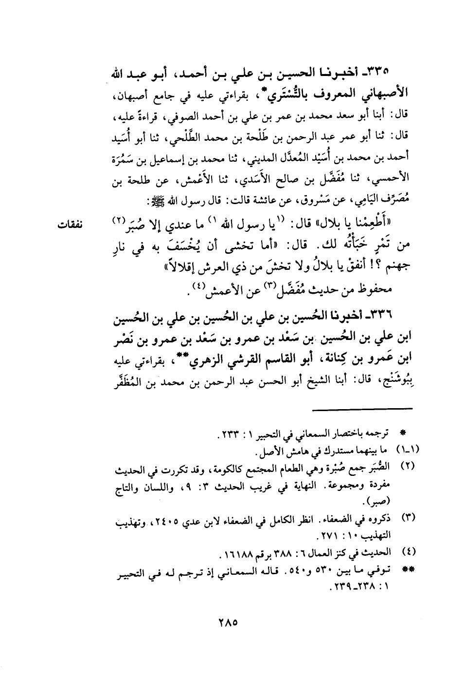 335- أخبرنا الحسين بن علي بن أحمد أبو عبد الله الأصبهاني المعروف بالتستري بقراءتي عليه في جامع أصبهان قال أبنا أبو سعد محمد بن عمر بن علي بن أحمد الصوفي قراءة عليه قال ثنا أبو عمر عبد الرحمن بن طلحة بن محمد الطلحي ثنا أبو أسيد أحمد بن محمد بن أسيد المعدل المديني ثنا محمد بن إسماعيل بن سمرة الأحمسي ثنا مفضل بن صالح الأسدي ثنا الأعمش عن طلحة بن مصرف اليامي عن مسروق عن عائشة قالت قال رسول الله صلى الله عليه وسلم: أطعمنا يا بلال. قال يا رسول الله ما عندي إلا صبر من تمر خبأته لك قال: أما تخشى أن يخسف به في نار جهنم أنفق يا بلال ولا تخش من ذي العرش إقلالا.