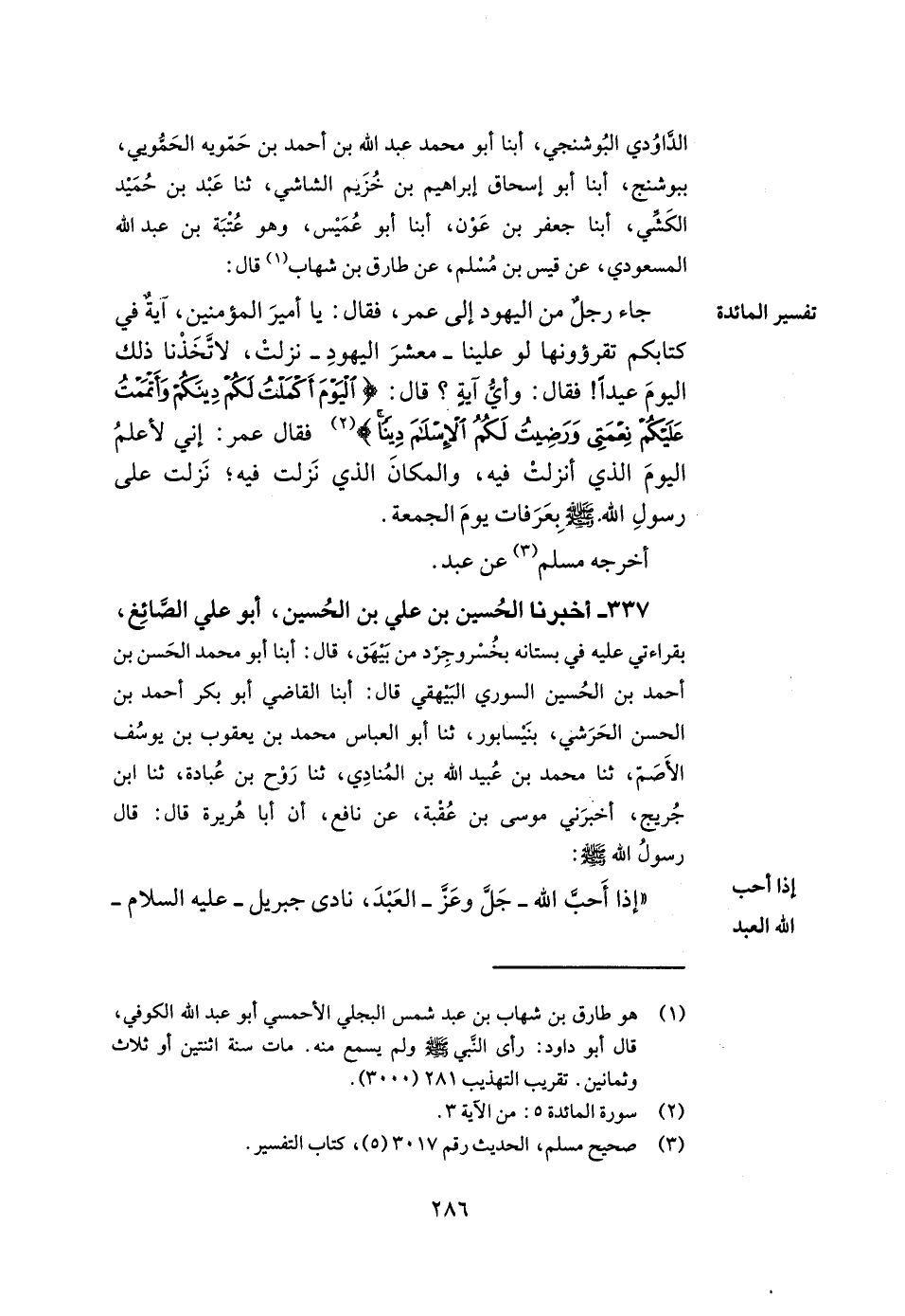 337- أخبرنا الحسين بن علي بن الحسين أبو علي الصائغ بقراءتي عليه في بستانه بخسروجرد من بيهق قال أبنا أبو محمد الحسن بن أحمد بن الحسين السوري البيهقي قال أبنا القاضي أبو بكر أحمد بن الحسن الحرشي بنيسابور ثنا أبو العباس محمد بن يعقوب بن يوسف الأصم ثنا محمد بن عبيد الله بن المنادي ثنا روح بن عبادة ثنا ابن جريج أخبرني موسى بن عقبة عن نافع أن أبا هريرة قال قال رسول الله صلى الله عليه وسلم إذا أحب الله جل وعز العبد نادى جبريل عليه السلام -[287]- إن الله قد أحب فلانا فأحبه فيحبه جبريل ثم ينادي جبريل في أهل السماء إن الله قد أحب فلانا فأحبوه فيحبه أهل السماء ثم يوضع له القبول في أهل الأرض.