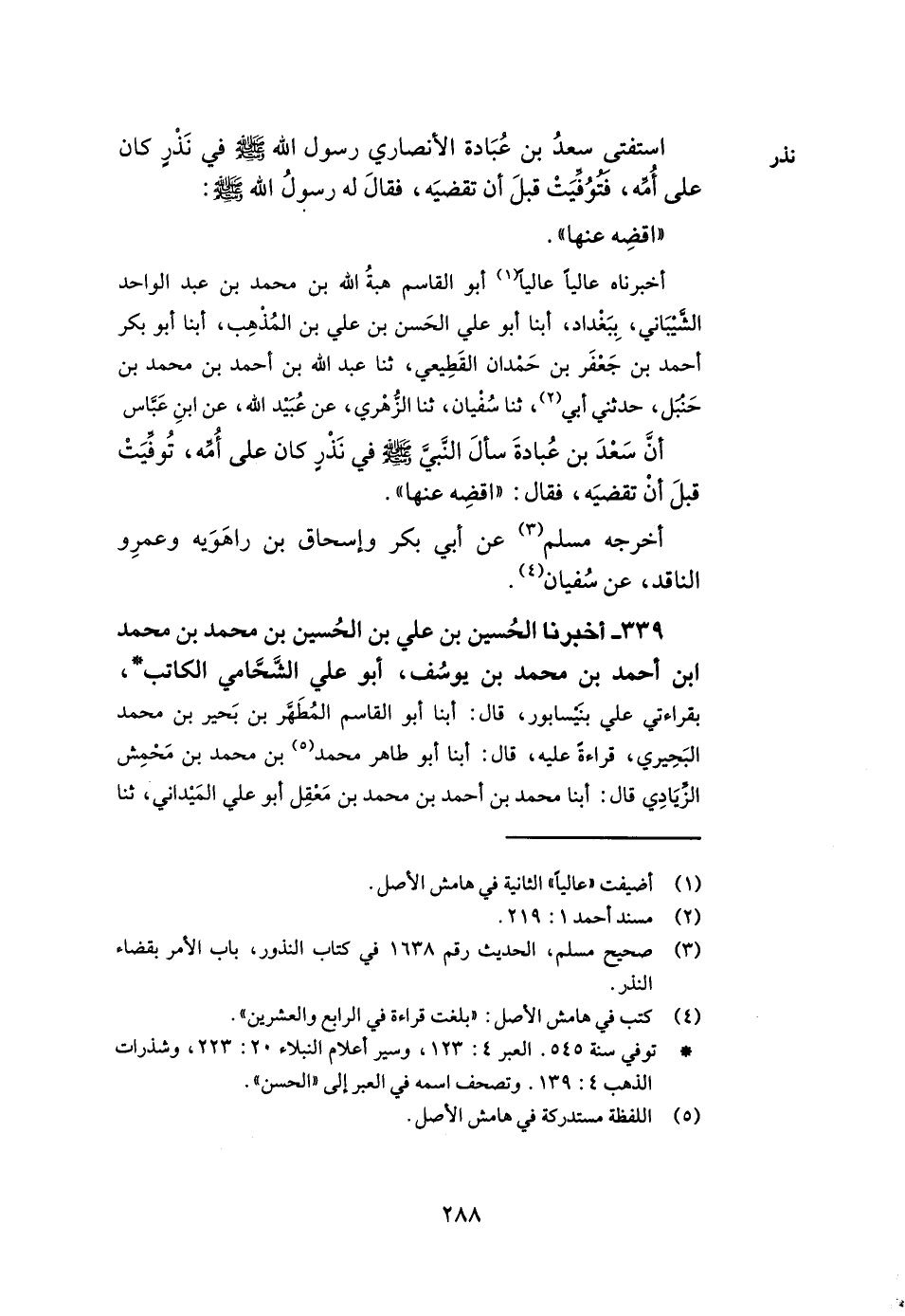 339- أخبرنا الحسين بن علي بن الحسين بن محمد بن محمد بن أحمد بن محمد بن يوسف أبو علي الشحامي الكاتب بقراءتي علي بنيسابور قال أبنا أبو القاسم المطهر بن بحير بن محمد البحيري قراءة عليه قال أبنا أبو طاهر محمد بن محمد بن محمش الزيادي قال أبنا محمد بن أحمد بن محمد بن معقل أبو علي الميداني ثنا -[289]- أبو عبد الله محمد بن يحيى بن عبد الله بن خالد بن فارس الذهلي ثنا عبد الرزاق أبنا معمر عن الزهري عن عروة عن عائشة قالت كان يدخل على أزواج النبي صلى الله عليه وسلم مخنث فكانوا يعدونه من غير أولي الإربة فدخل النبي صلى الله عليه وسلم على بعض نسائه وهو ينعت امرأة فقال إنها إذا أقبلت أقبلت بأربع وإذا أدبرت أدبرت بثمان فقال النبي صلى الله عليه وسلم لا أرى هذا يعلم ما هاهنا لا يدخلن عليكم هذا فحجبوه.