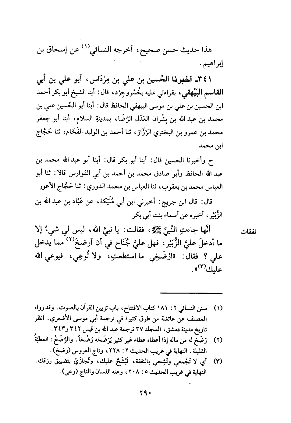 341- أخبرنا الحسين بن علي بن مرداس أبو علي بن أبي القاسم البيهقي بقراءتي عليه بخسروجرد قال أبنا الشيخ أبو بكر أحمد بن الحسين بن علي بن موسى البيهقي الحافظ قال أبنا أبو الحسين علي بن محمد بن عبد الله بن بشران العدل الرضا بمدينة السلام أبنا أبو جعفر محمد بن عمرو بن البختري الرزاز ثنا أحمد بن الوليد الفحام ثنا حجاج بن محمد ح وأخبرنا الحسين قال أبنا أبو بكر قال أبنا أبو عبد الله محمد بن عبد الله الحافظ وأبو صادق محمد بن أحمد بن أبي الفوارس قالا ثنا أبو العباس محمد بن يعقوب ثنا العباس بن محمد الدوري ثنا حجاج الأعور قال قال ابن جريج أخبرني ابن أبي مليكة عن عباد بن عبد الله بن الزبير أخبره عن أسماء بنت أبي بكر أنها جاءت النبي صلى الله عليه وسلم فقالت يا نبي الله ليس لي شيء إلا ما أدخل علي الزبير فهل علي جناح في أن أرضخ مما يدخل علي فقال ارضخي ما استطعت ولا توعي فيوعي الله عليك.
