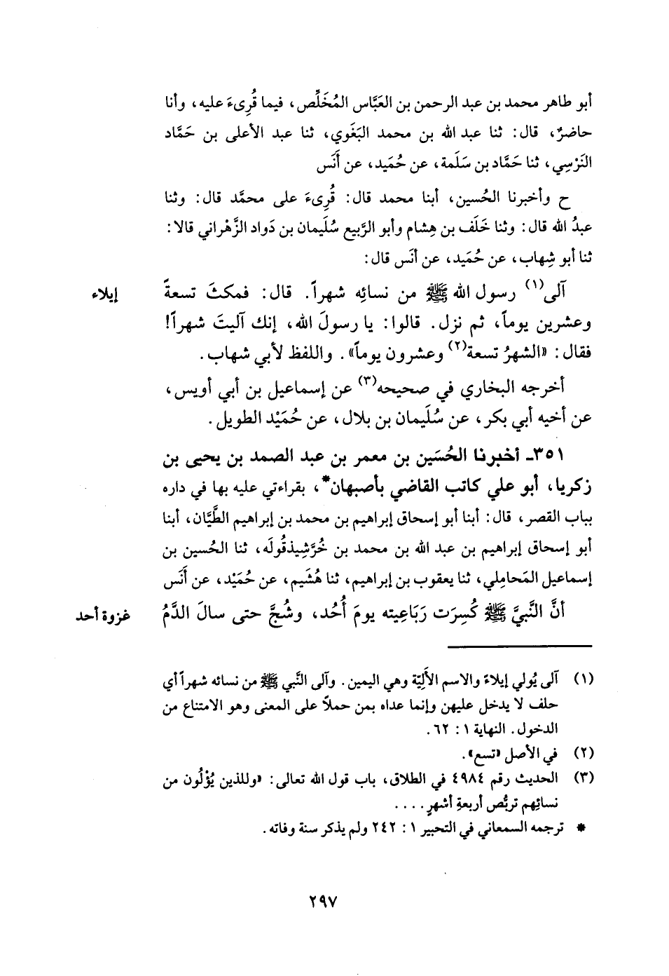 351- أخبرنا الحسين بن معمر بن عبد الصمد بن يحيى بن زكريا أبو علي كاتب القاضي بأصبهان بقراءتي عليه بها في داره بباب القصر قال أبنا أبو إسحاق إبراهيم بن محمد بن إبراهيم الطيان أبنا أبو إسحاق إبراهيم بن عبد الله بن محمد بن خرشيذ قوله ثنا الحسين بن إسماعيل المحاملي ثنا يعقوب بن إبراهيم ثنا هشيم عن حميد عن أنس أن النبي صلى الله عليه وسلم كسرت رباعيته يوم أحد وشج حتى سال الدم -[298]- على وجهه فقال كيف يفلح قوم فعلوا هذا بنبيهم وهو يدعوهم إلى ربهم عز وجل فنزلت: {ليس لك من الأمر شيء أو يتوب عليهم أو يعذبهم فإنهم ظالمون} .