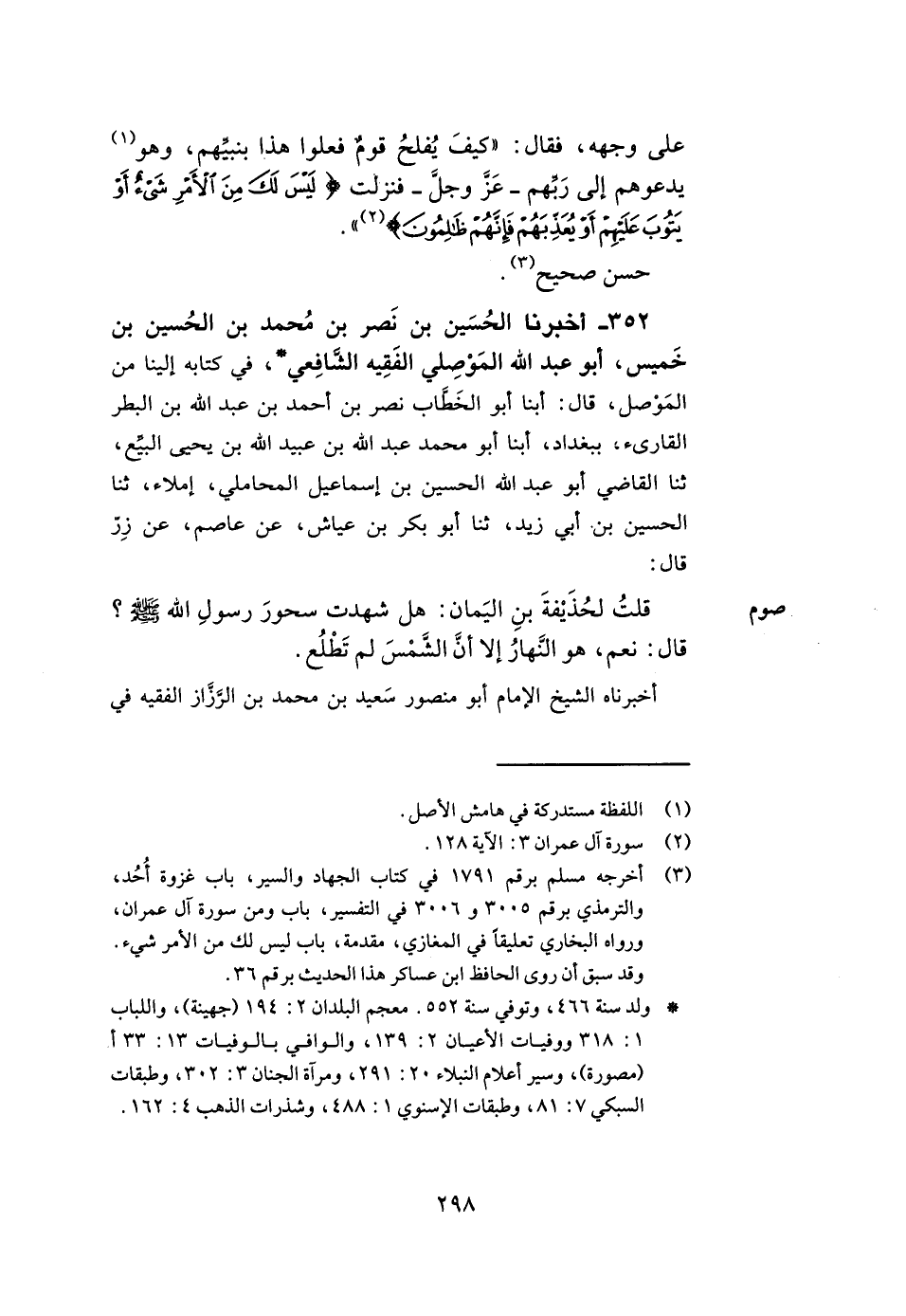 352- أخبرنا الحسين بن نصر بن محمد بن الحسين بن خميس أبو عبد الله الموصلي الفقيه الشافعي في كتابه إلينا من الموصل قال أبنا أبو الخطاب نصر بن أحمد بن عبد الله بن البطر القارئ ببغداد أبنا أبو محمد عبد الله بن عبيد الله بن يحيى البيع ثنا القاضي أبو عبد الله الحسين بن إسماعيل المحاملي إملاء ثنا الحسين بن أبي زيد ثنا أبو بكر بن عياش عن عاصم عن زر قال قلت لحذيفة بن اليمان هل شهدت سحور رسول الله صلى الله عليه وسلم قال نعم هو النهار إلا أن الشمس لم تطلع.