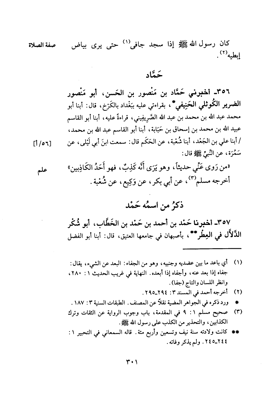 356- أخبرني حماد بن منصور بن الحسن أبو منصور الضرير الكوثلي الحنيفي بقراءتي عليه ببغداد بالكرخ قال أبنا أبو محمد عبد الله بن محمد بن عبد الله الصريفيني قراءة عليه أبنا أبو القاسم عبيد الله بن محمد بن إسحاق بن حبابة أبنا أبو القاسم عبد الله بن محمد أبنا علي بن الجعد أبنا شعبة عن الحكم قال سمعت ابن أبي ليلى عن سمرة عن النبي صلى الله عليه وسلم قال من روى عني حديثا وهو يرى أنه كذب فهو أحد الكاذبين. أخرجه مسلم عن أبي بكر عن وكيع عن شعبة.