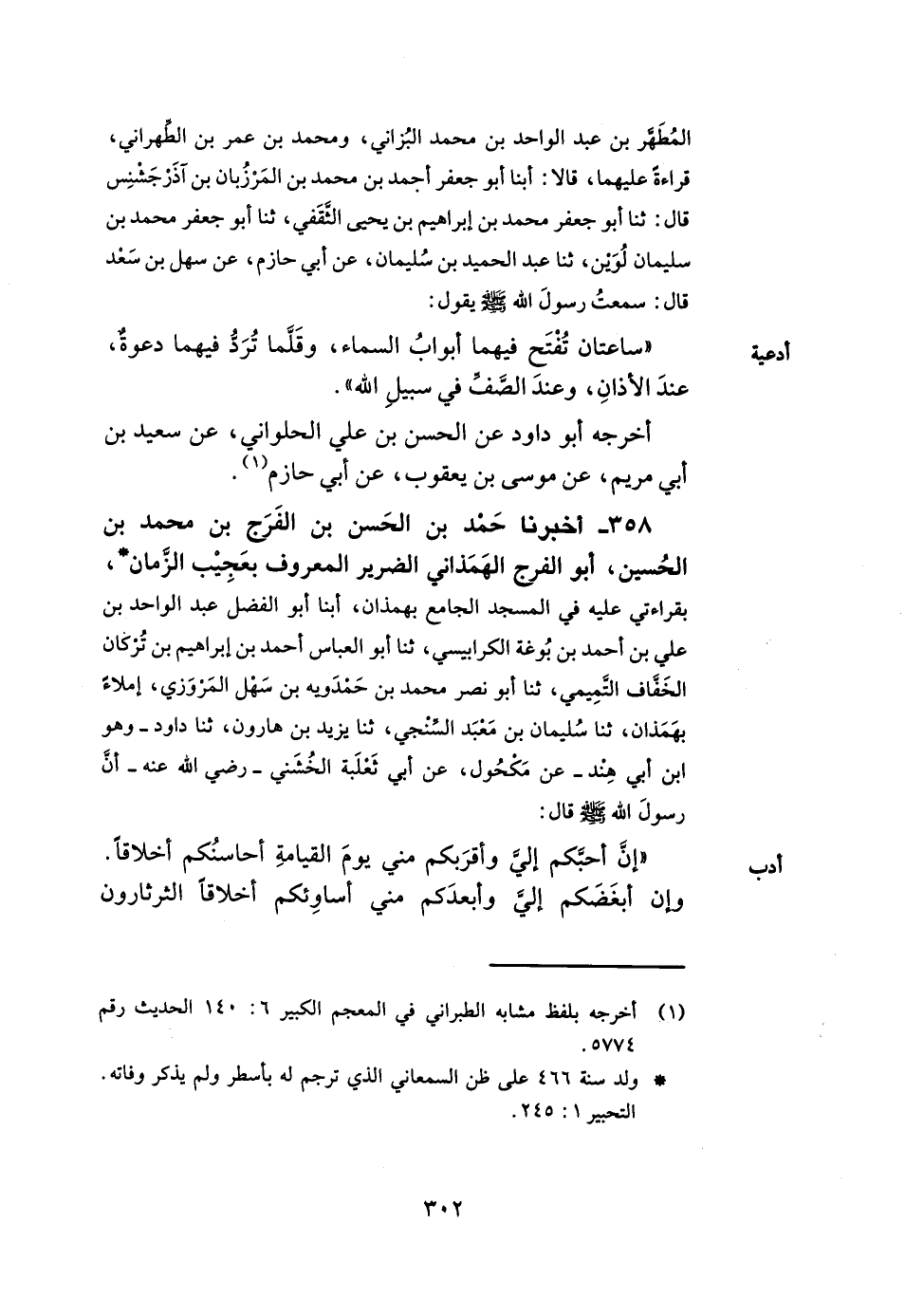358- أخبرنا حمد بن الحسن بن الفرج بن محمد بن الحسين أبو الفرج الهمذاني الضرير المعروف بعجيب الزمان بقراءتي عليه في المسجد الجامع بهمذان أبنا أبو الفضل عبد الواحد بن علي بن أحمد بن بوغة الكرابيسي ثنا أبو العباس أحمد بن إبراهيم بن تركان الخفاف التميمي ثنا أبو نصر محمد بن حمدويه بن سهل المروزي إملاء بهمذان ثنا سليمان بن معبد السنجي ثنا يزيد بن هارون ثنا داود وهو ابن أبي هند عن مكحول عن أبي ثعلبة الخشني رضي الله عنه أن رسول الله صلى الله عليه وسلم قال إن أحبكم إلي وأقربكم مني يوم القيامة أحاسنكم أخلاقا وإن أبغضكم إلي وأبعدكم مني أساوئكم أخلاقا الثرثارون -[303]- المتفيهقون المتشدقون.