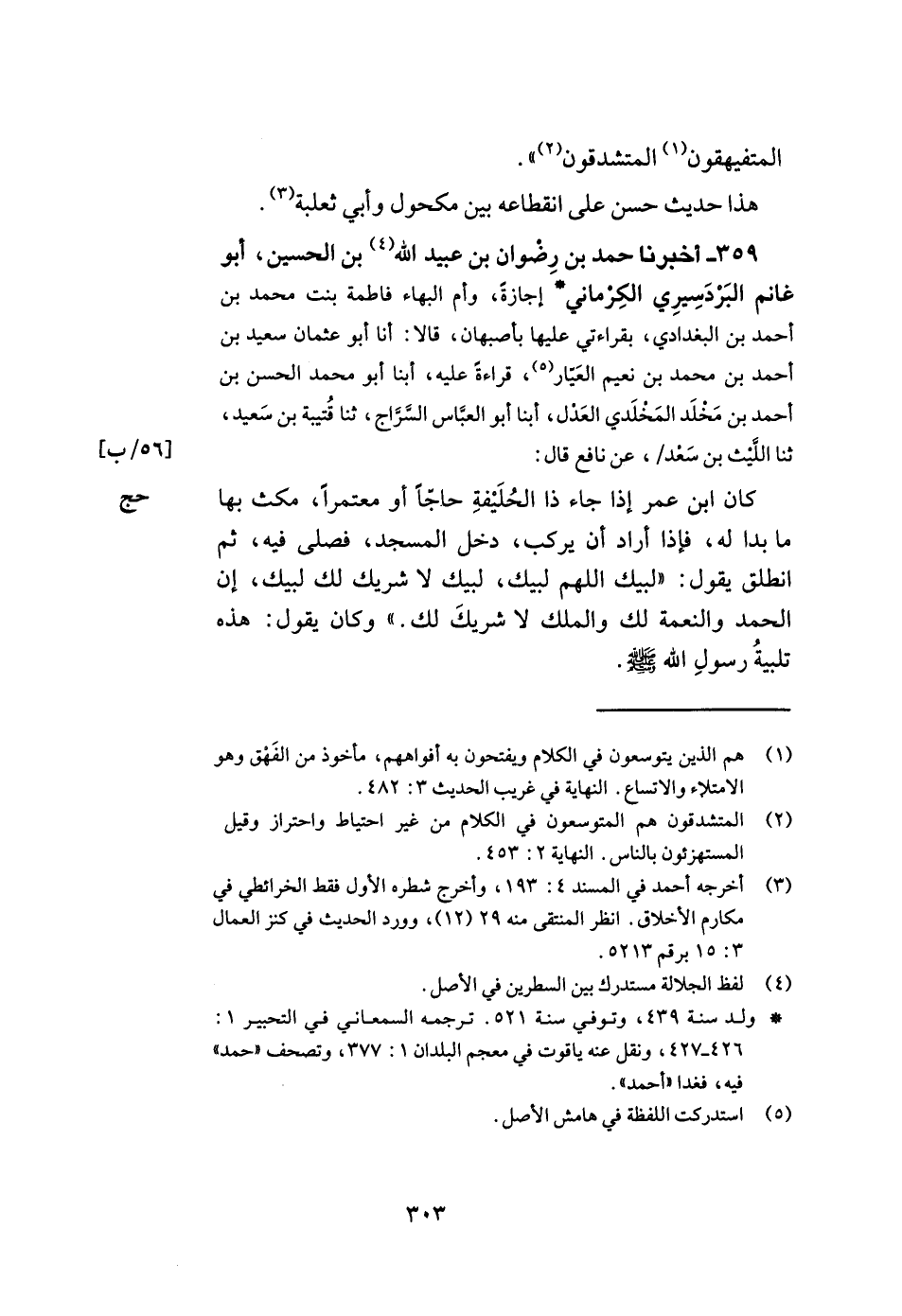 359- أخبرنا حمد بن رضوان بن عبيد الله بن الحسين أبو غانم البردسيري الكرماني إجازة وأم البهاء فاطمة بنت محمد بن أحمد بن البغدادي بقراءتي عليها بأصبهان قالا أنا أبو عثمان سعيد بن أحمد بن محمد بن نعيم العيار قراءة عليه أبنا أبو محمد الحسن بن أحمد بن مخلد المخلدي العدل أبنا أبو العباس السراج ثنا قتيبة بن سعيد ثنا الليث بن سعد عن نافع قال كان ابن عمر إذا جاء ذا الحليفة حاجا أو معتمرا مكث بها ما بدا له فإذا أراد أن يركب دخل المسجد فصلى فيه ثم انطلق يقول لبيك اللهم لبيك لبيك لا شريك لك لبيك إن الحمد والنعمة لك والملك لا شريك لك وكان يقول هذه تلبية رسول الله صلى الله عليه وسلم.