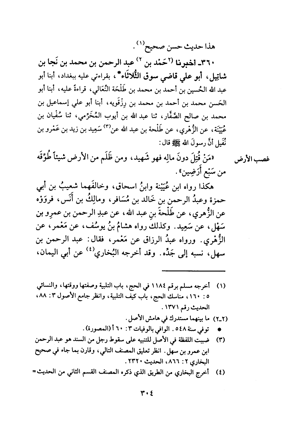 360- أخبرنا حمد بن عبد الرحمن بن محمد بن نجا بن شاتيل أبو علي قاضي سوق الثلاثاء بقراءتي عليه ببغداد أبنا أبو عبد الله الحسين بن أحمد بن محمد بن طلحة النعالي قراءة عليه أبنا أبو الحسن محمد بن أحمد بن محمد بن رزقويه أبنا أبو علي إسماعيل بن محمد بن صالح الصفار ثنا عبد الله بن أيوب المخرمي ثنا سفيان بن عيينة عن الزهري عن طلحة بن عبد الله عن سعيد بن زيد بن عمرو بن نفيل أن رسول الله صلى الله عليه وسلم قال من قتل دون ماله فهو شهيد ومن ظلم من الأرض شيئا طوقه من سبع أرضين. هكذا رواه ابن عيينة وابن إسحاق وخالفهما شعيب بن أبي حمزة وعبد الرحمن بن خالد بن مسافر ومالك بن أنس فرووه عن الزهري عن طلحة بن عبد الله عن عبد الرحمن بن عمرو بن سهل عن سعيد وكذلك رواه هشام بن يوسف عن معمر عن الزهري ورواه عبد الرزاق عن معمر فقال عبد الرحمن بن سهل نسبه إلى جده