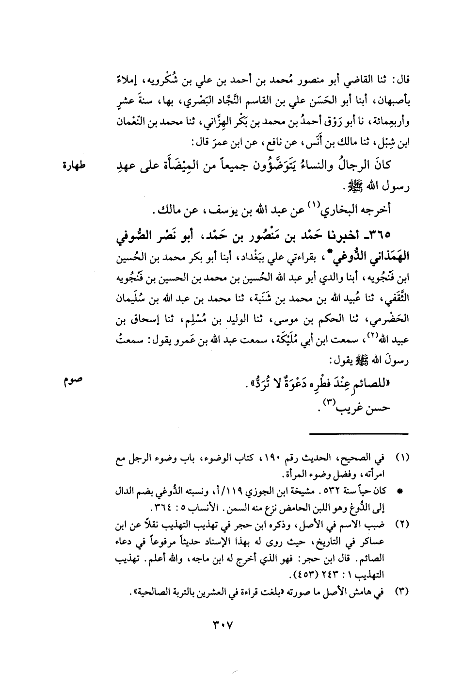 365- أخبرنا حمد بن منصور بن حمد أبو نصر الصوفي الهمذاني الدوغي بقراءتي علي ببغداد أبنا أبو بكر محمد بن الحسين بن فنجويه أبنا والدي أبو عبد الله الحسين بن محمد بن الحسين بن فنجويه الثقفي ثنا عبيد الله بن محمد بن شنبة ثنا محمد بن عبد الله بن سليمان الحضرمي ثنا الحكم بن موسى ثنا الوليد بن مسلم ثنا إسحاق بن عبيد الله سمعت ابن أبي مليكة سمعت عبد الله بن عمرو يقول سمعت رسول الله صلى الله عليه وسلم يقول للصائم عند فطره دعوة لا ترد.
