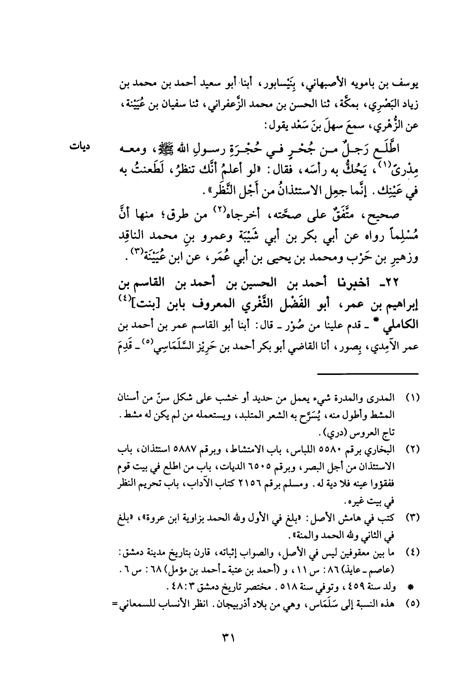 22- أخبرنا أحمد بن الحسين بن أحمد بن القاسم بن إبراهيم بن عمر أبو الفضل الثغري المعروف بابن بنت الكاملي قدم علينا من صور قال أبنا أبو القاسم عمر بن أحمد بن عمر الآمدي بصور أنا القاضي أبو بكر أحمد بن حريز السلماسي قدم -[32]- علينا ثغر آمد حماه الله قراءة عليه وأنا أسمع قال ثنا أبو علي الحسين بن محمد بن يوسف اللحياني بسلماس ثنا أبو القاسم عبد الله بن محمد بن عبد العزيز البغوي أبنا علي بن الجعد أبنا شعبة وشيبان عن قتادة قال سمعت أنس بن مالك يقول صليت خلف رسول الله صلى الله عليه وسلم وأبي بكر وعمر وعثمان فلم أسمع أحدا منهم يجهر بـ بسم الله الرحمن الرحيم. أخبرناه عاليا أبو المظفر طاهر بن محمد بن طاهر بن سعيد البروجردي بمكة وأبو القاسم إسماعيل بن أحمد بن عمر بن السمرقندي ببغداد قالا أبنا عبد الله بن محمد بن عبد الله الصريفيني أبنا عبيد الله بن محمد بن حبابة ثنا عبد الله بن محمد البغوي فذكره.