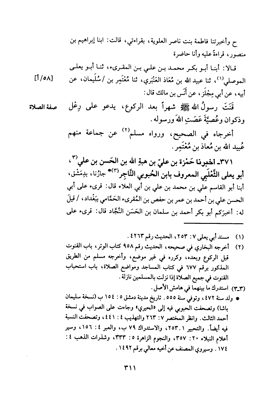371- أخبرنا حمزة بن علي بن هبة الله بن الحسن بن علي أبو يعلى الثعلبي المعروف بابن الحبوبي التاجر جارنا بدمشق أبنا أبو القاسم علي بن محمد بن علي بن أبي العلاء قال قرئ على أبي الحسن علي بن أحمد بن عمر بن حفص بن المقرئ الحمامي ببغداد قيل له أخبركم أبو بكر أحمد بن سلمان بن الحسن النجاد قال قرئ على -[312]- الحسن بن مكرم وأنا أسمع نا علي بن عاصم ثنا خالد الحذاء وهشام بن حسان عن محمد بن سيرين عن أبي هريرة قال قال رسول الله صلى الله عليه وسلم إذا جاء أحدكم إلى الصلاة فلا يسع ولكن ليمش وعليه السكينة والوقار فليصل ما أدرك وليقض ما سبقه.