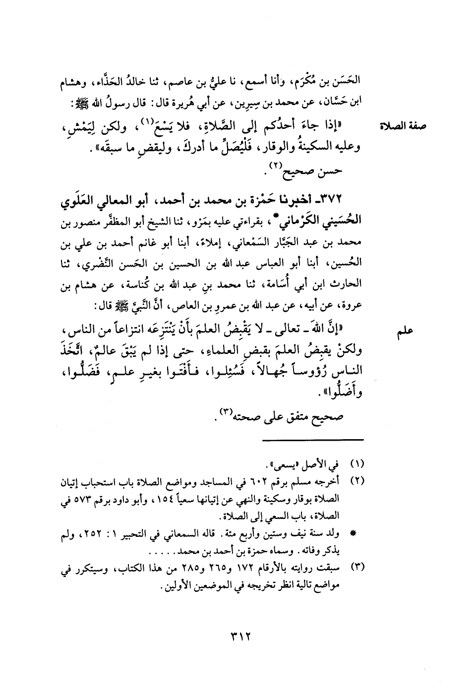 372- أخبرنا حمزة بن محمد بن أحمد أبو المعالي العلوي الحسيني الكرماني بقراءتي عليه بمرو ثنا الشيخ أبو المظفر منصور بن محمد بن عبد الجبار السمعاني إملاء أبنا أبو غانم أحمد بن علي بن الحسين أبنا أبو العباس عبد الله بن الحسين بن الحسن النضري ثنا الحارث ابن أبي أسامة ثنا محمد بن عبد الله بن كناسة عن هشام بن عروة عن أبيه عن عبد الله بن عمرو بن العاص أن النبي صلى الله عليه وسلم قال إن الله تعالى لا يقبض العلم بأن ينتزعه انتزاعا من الناس ولكن يقبض العلم بقبض العلماء حتى إذا لم يبق عالم اتخذ الناس رؤوسا جهالا فسئلوا فأفتوا بغير علم فضلوا وأضلوا.