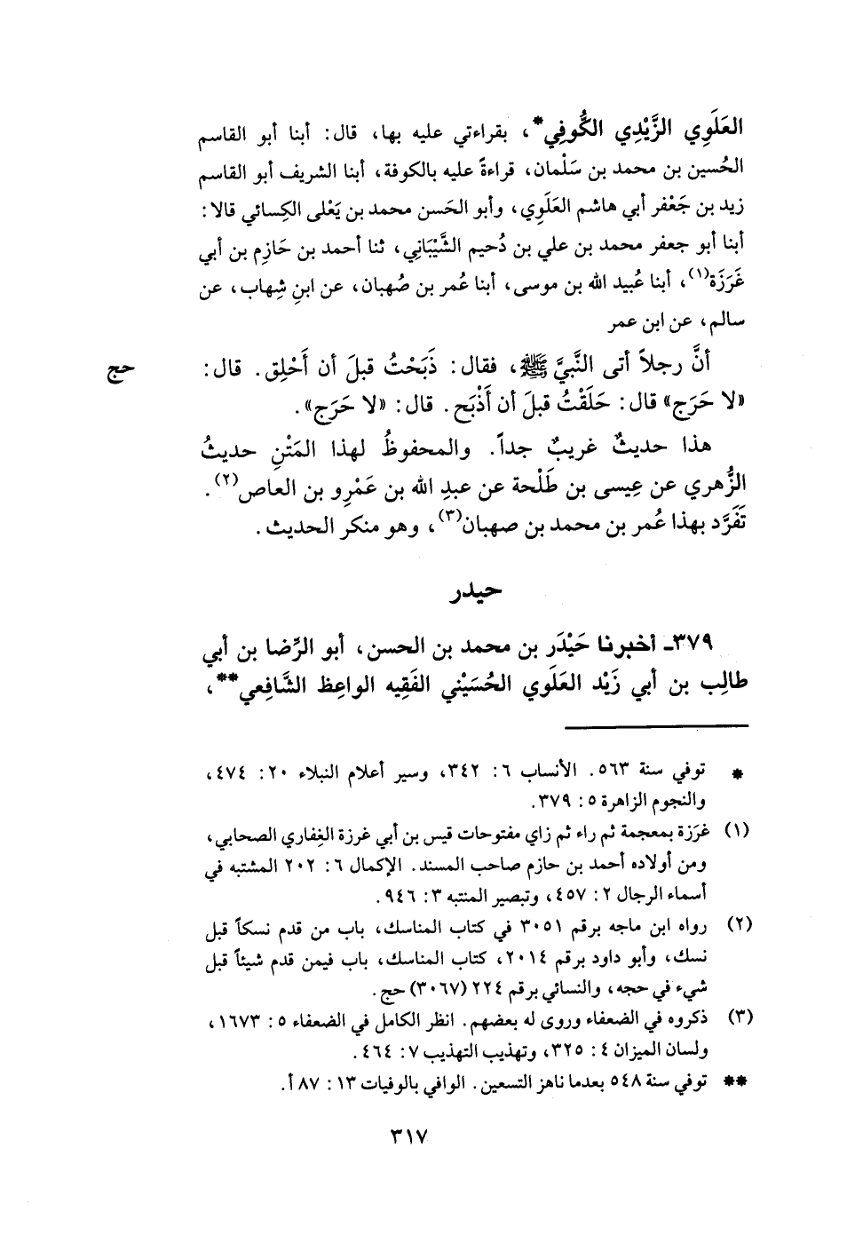 379- أخبرنا حيدر بن محمد بن الحسن أبو الرضا بن أبي طالب بن أبي زيد العلوي الحسيني الفقيه الواعظ الشافعي -[318]- بقراءتي عليه بأصبهان قال أبنا أبو عبد الله مالك بن أحمد بن علي البانياسي أبنا أبو الحسن أحمد بن محمد بن موسى المجبر أبنا أبو إسحاق إبراهيم بن عبد الصمد بن موسى الإمام ثنا أبو سعيد الأشج وهو عبد الله بن سعيد نا المحاربي وهو عبد الرحمن بن محمد الكوفي عن يحيى بن سعيد عن محمد بن إبراهيم عن علقمة بن وقاص عن عمر بن الخطاب قال سمعت رسول الله صلى الله عليه وسلم يقول إنما الأعمال بالنية وإنما لامرئ ما نوى فمن كانت هجرته إلى الله ورسوله فهجرته إلى الله ورسوله ومن كانت هجرته إلى دنيا يصيبها أو امرأة يتزوجها فهجرته إلى ما هاجر إليه.