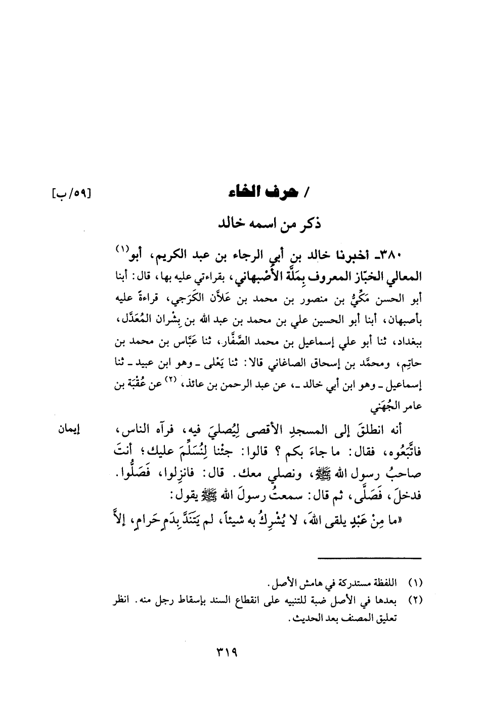 380- أخبرنا خالد بن أبي الرجاء بن عبد الكريم أبو المعالي الخباز المعروف بملة الأصبهاني بقراءتي عليه بها قال أبنا أبو الحسن مكي بن منصور بن محمد بن علان الكرجي قراءة عليه بأصبهان أبنا أبو الحسين علي بن محمد بن عبد الله بن بشران المعدل ببغداد ثنا أبو علي إسماعيل بن محمد الصفار ثنا عباس بن محمد بن حاتم ومحمد بن إسحاق الصاغاني قالا ثنا يعلى وهو ابن عبيد ثنا إسماعيل وهو ابن أبي خالد عن عبد الرحمن بن عائذ عن عقبة بن عامر الجهني أنه انطلق إلى المسجد الأقصى ليصلي فيه فرآه الناس فاتبعوه فقال ما جاء بكم قالوا جئنا لنسلم عليك أنت صاحب رسول الله صلى الله عليه وسلم ونصلي معك قال فانزلوا فصلوا فدخل فصلى ثم قال سمعت رسول الله صلى الله عليه وسلم يقول ما من عبد يلقى الله لا يشرك به شيئا لم يتند بدم حرام إلا -[320]- دخل من أي أبواب الجنة يشاء. هكذا جاء في هذه الرواية والمحفوظ من حديث إسماعيل عن عبد الرحمن بن عائذ عن رجل لم يسم عن عقبة.