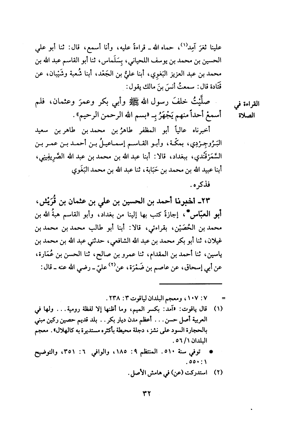 23- أخبرنا أحمد بن الحسين بن علي بن عثمان بن قريش أبو العباس إجازة كتب بها إلينا من بغداد وأبو القاسم هبة الله بن محمد بن الحصين بقراءتي قالا أبنا أبو طالب محمد بن محمد بن غيلان ثنا أبو بكر محمد بن عبد الله الشافعي حدثني عبد الله بن محمد بن ياسين ثنا أحمد بن المقدام ثنا عمرو بن صالح ثنا الحسن بن عمارة عن أبي إسحاق عن عاصم بن ضمرة عن علي رضي الله عنه قال -[33]- كنت عند رسول الله صلى الله عليه وسلم إذ أقبل أبو بكر وعمر فقال يا علي هذان سيدا كهول أهل الجنة من الأولين والآخرين إلا النبيين والمرسلين.