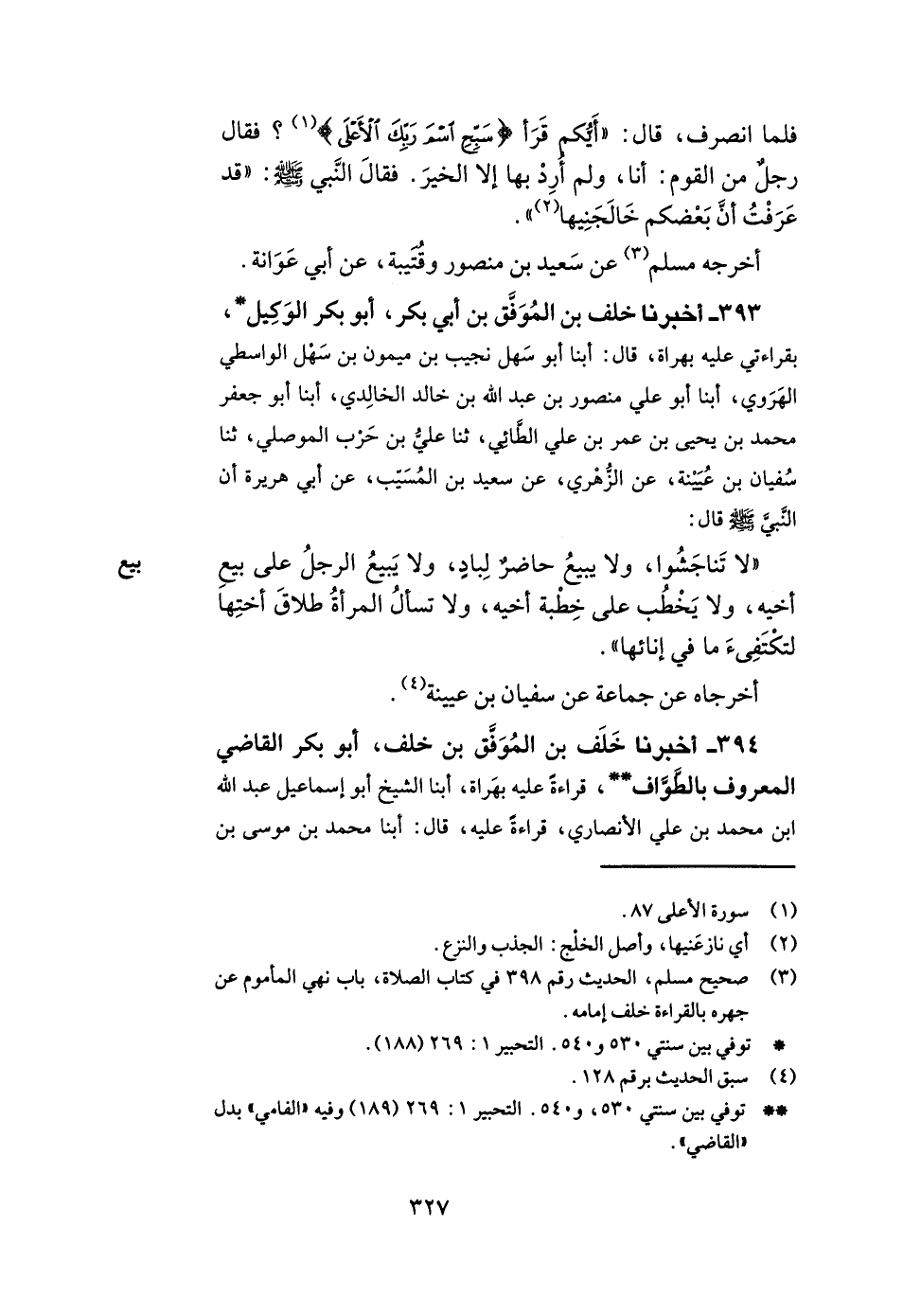393- أخبرنا خلف بن الموفق بن أبي بكر أبو بكر الوكيل بقراءتي عليه بهراة قال أبنا أبو سهل نجيب بن ميمون بن سهل الواسطي الهروي أبنا أبو علي منصور بن عبد الله بن خالد الخالدي أبنا أبو جعفر محمد بن يحيى بن عمر بن علي الطائي ثنا علي بن حرب الموصلي ثنا سفيان بن عيينة عن الزهري عن سعيد بن المسيب عن أبي هريرة أن النبي صلى الله عليه وسلم قال لا تناجشوا ولا يبيع حاضر لباد ولا يبيع الرجل على بيع أخيه ولا يخطب على خطبة أخيه ولا تسأل المرأة طلاق أختها لتكتفئ ما في إنائها.