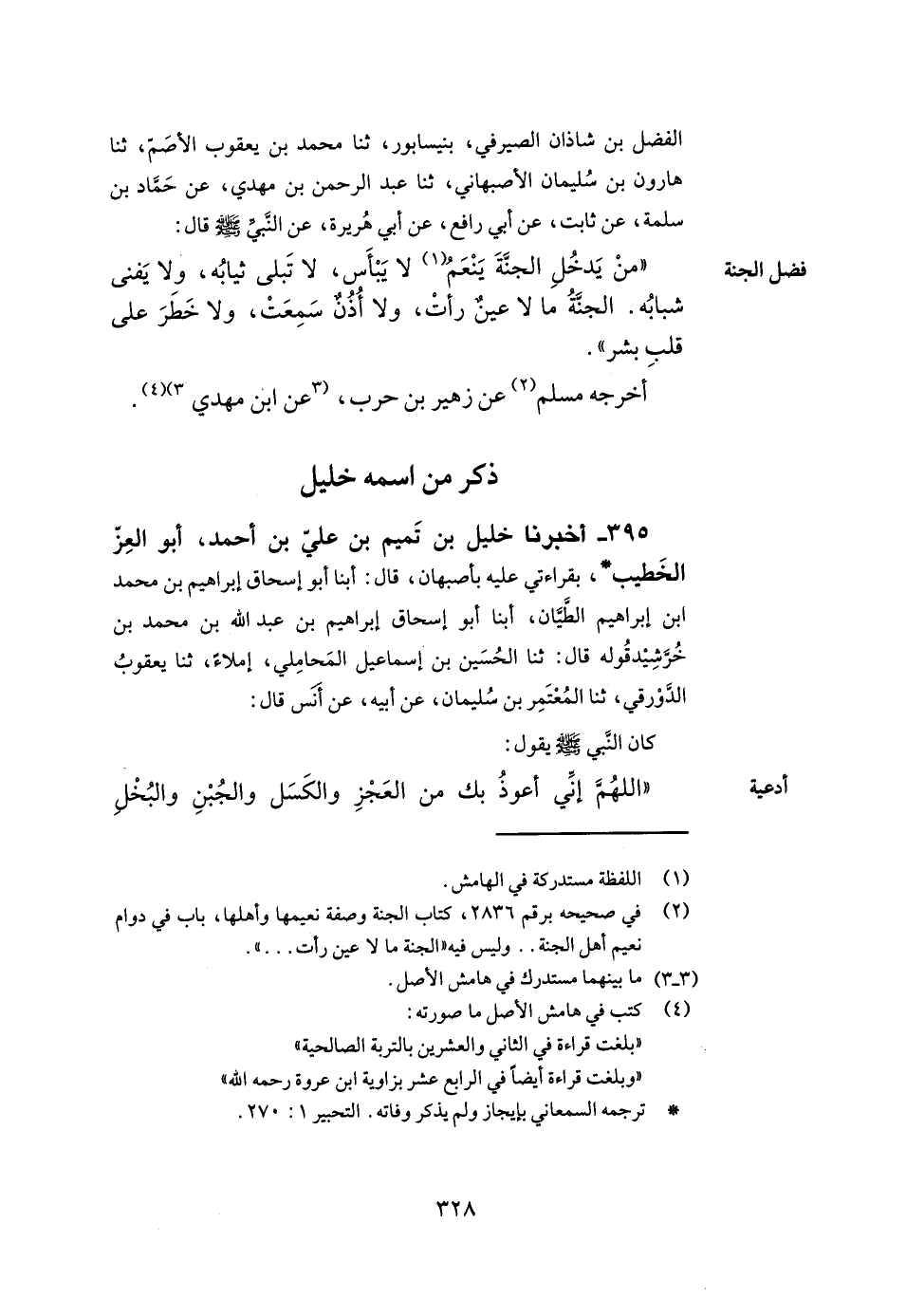 395- أخبرنا خليل بن تميم بن علي بن أحمد أبو العز الخطيب بقراءتي عليه بأصبهان قال أبنا أبو إسحاق إبراهيم بن محمد بن إبراهيم الطيان أبنا أبو إسحاق إبراهيم بن عبد الله بن محمد بن خرشيد قوله قال ثنا الحسين بن إسماعيل المحاملي إملاء ثنا يعقوب الدورقي ثنا المعتمر بن سليمان عن أبيه عن أنس قال كان النبي صلى الله عليه وسلم يقول اللهم إني أعوذ بك من العجز والكسل والجبن والبخل -[329]- والهرم وأعوذ بك من عذاب القبر وأعوذ بك من فتنة المحيا وفتنة الممات.