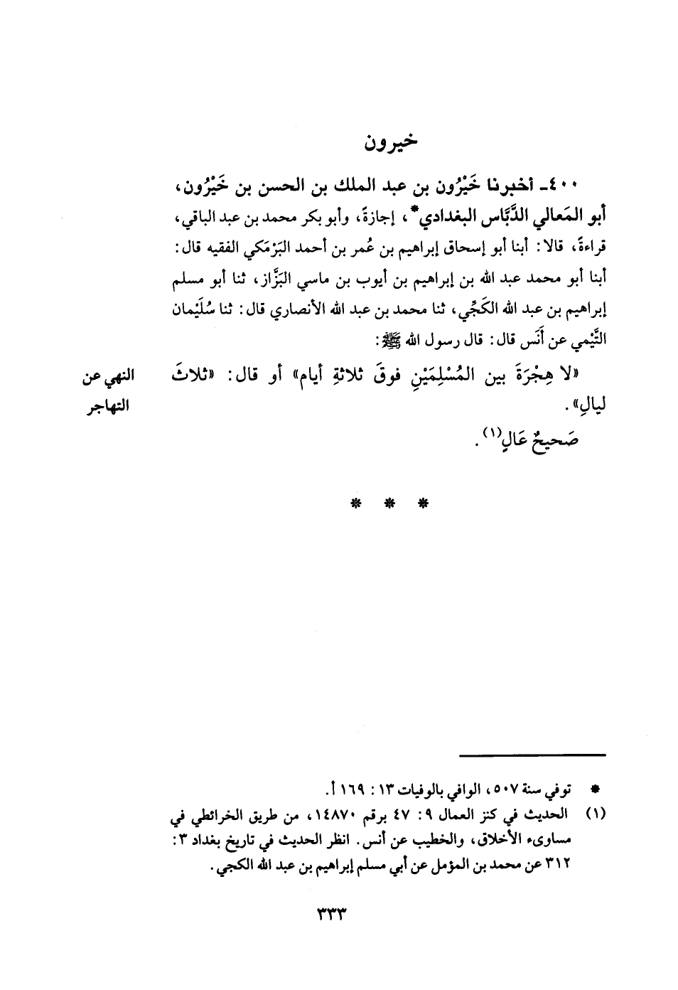 400- أخبرنا خيرون بن عبد الملك بن الحسن بن خيرون أبو المعالي الدباس البغدادي إجازة وأبو بكر محمد بن عبد الباقي قراءة قالا أبنا أبو إسحاق إبراهيم بن عمر بن أحمد البرمكي الفقيه قال أبنا أبو محمد عبد الله بن إبراهيم بن أيوب بن ماسي البزاز ثنا أبو مسلم إبراهيم بن عبد الله الكجي ثنا محمد بن عبد الله الأنصاري قال ثنا سليمان التيمي عن أنس قال قال رسول الله صلى الله عليه وسلم لا هجرة بين المسلمين فوق ثلاثة أيام أو قال ثلاث ليال.