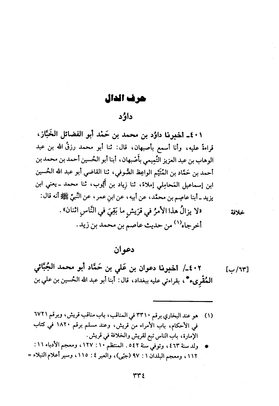 401- أخبرنا داود بن محمد بن حمد أبو الفضائل الخباز قراءة عليه وأنا أسمع بأصبهان قال ثنا أبو محمد رزق الله بن عبد الوهاب بن عبد العزيز التميمي بأصبهان أبنا أبو الحسين أحمد بن محمد بن أحمد بن حماد بن المتيم الواعظ الصوفي ثنا القاضي أبو عبد الله الحسين بن إسماعيل المحاملي إملاء ثنا زياد بن أيوب ثنا محمد يعني ابن يزيد أبنا عاصم بن محمد عن أبيه عن ابن عمر عن النبي صلى الله عليه وسلم أنه قال لا يزال هذا الأمر في قريش ما بقي في الناس اثنان.