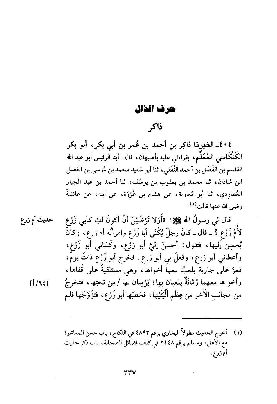404- أخبرنا ذاكر بن أحمد بن عمر بن أبي بكر أبو بكر الكنكاسي المعلم بقراءتي عليه بأصبهان قال أبنا الرئيس أبو عبد الله القاسم بن الفضل بن أحمد الثقفي ثنا أبو سعيد محمد بن موسى بن الفضل بن شاذان ثنا محمد بن يعقوب بن يوسف ثنا أحمد بن عبد الجبار العطاردي ثنا أبو معاوية عن هشام بن عروة عن أبيه عن عائشة رضي الله عنها قالت قال لي رسول الله صلى الله عليه وسلم: أولا ترضين أن أكون لك كأبي زرع لأم زرع قال كان رجل يكنى أبا زرع وامرأته أم زرع وكان يحسن إليها فتقول أحسن إلي أبو زرع وكساني أبو زرع وأعطاني أبو زرع وفعل بي أبو زرع فخرج أبو زرع ذات يوم فمر على جارية يلعب معها أخواها وهي مستلقية على قفاها وأخواها معهما رمانة يلعبان بها يرميان بها من تحتها فتخرج من الجانب الآخر من عظم أليتيها فخطبها أبو زرع فتزوجها فلم -[338]- تزل به أم زرع حتى طلقها فتزوجت أم زرع رجلا فأكرمها أيضا فكانت تقول أكرمني وأعطاني وفعل بي وتقول في آخر ذلك لو جمع ذلك كله ما ملأ أصغر وعاء لأبي زرع