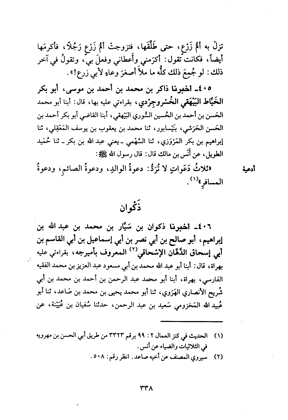 405- أخبرنا ذاكر بن محمد بن أحمد بن موسى أبو بكر الخياط البيهقي الخسروجردي بقراءتي عليه بها قال أبنا أبو محمد الحسن بن أحمد بن الحسين السوري البيهقي أبنا القاضي أبو بكر أحمد بن الحسن الحرشي بنيسابور ثنا محمد بن يعقوب بن يوسف المعقلي ثنا إبراهيم بن بكر المروزي ثنا السهمي يعني عبد الله بن بكر ثنا حميد الطويل عن أنس بن مالك قال قال رسول الله صلى الله عليه وسلم: ثلاث دعوات لا ترد دعوة الوالد ودعوة الصائم ودعوة المسافر