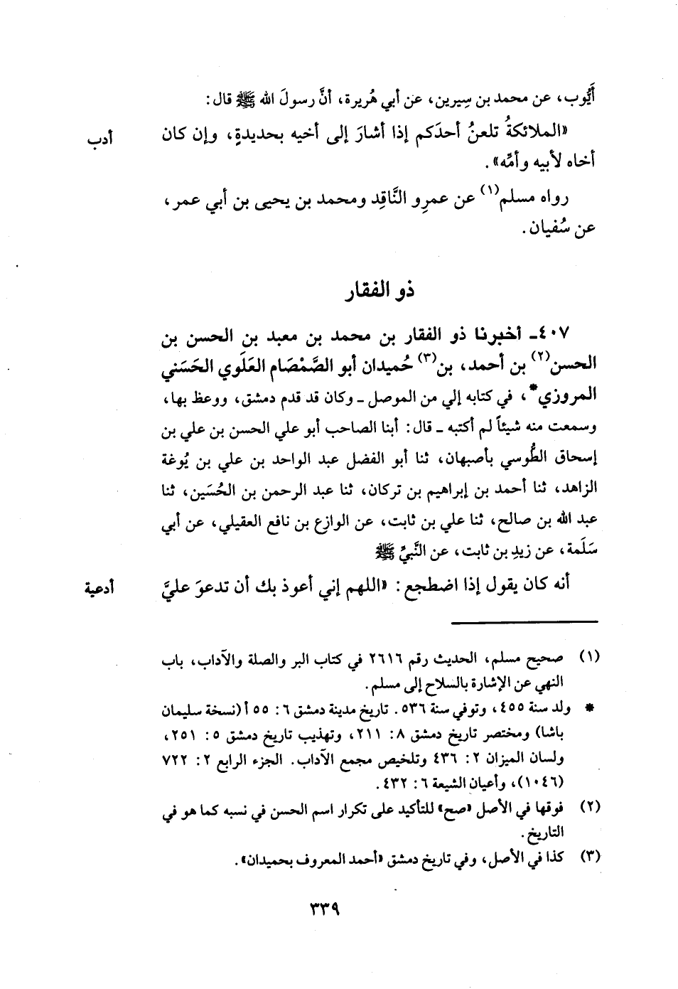 407- أخبرنا ذو الفقار بن محمد بن معبد بن الحسن بن الحسن بن أحمد بن حميدان أبو الصمصام العلوي الحسني المروزي في كتابه إلي من الموصل وكان قد قدم دمشق ووعظ بها وسمعت منه شيئا لم أكتبه قال أبنا الصاحب أبو علي الحسن بن علي بن إسحاق الطوسي بأصبهان ثنا أبو الفضل عبد الواحد بن علي بن يوغة الزاهد ثنا أحمد بن إبراهيم بن تركان ثنا عبد الرحمن بن الحسين ثنا عبد الله بن صالح ثنا علي بن ثابت عن الوازع بن نافع العقيلي عن أبي سلمة عن زيد بن ثابت عن النبي صلى الله عليه وسلم أنه كان يقول إذا اضطجع: اللهم إني أعوذ بك أن تدعو علي -[340]- رحم قطعتها أو نفس ظلمتها وأسألك غنى النفس
