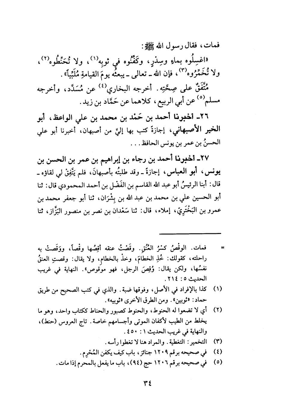 27- أخبرنا أحمد بن رجاء بن إبراهيم بن عمر بن الحسن بن يونس أبو العباس إجازة وقد طلبته بأصبهان فلم يتفق لي لقاؤه قال أبنا الرئيس أبو عبد الله القاسم بن الفضل بن أحمد المحمودي قال ثنا أبو الحسين علي بن محمد بن عبد الله بن بشران ثنا أبو جعفر محمد بن عمرو بن البختري إملاء قال ثنا سعدان بن نصر بن منصور البزاز ثنا -[35]- سفيان بن عيينة عن الزهري عن سالم عن أبيه يبلغ به النبي صلى الله عليه وسلم قال خمس من الدواب لا جناح في قتلهن في الحل والحرم الغراب والفأرة والحدأة والعقرب والكلب العقور. أخبرناه أبو سعيد شيبان بن عبد الله بن شيبان المعلم وأبو الفتوح بندار بن غانم بن محمد المعروف بهمزجي وأبو القاسم بنيمان بن محمد بن الفضل المعدل في آخرين قالوا أبنا أبو عبد الله القاسم بن الفضل فذكره.