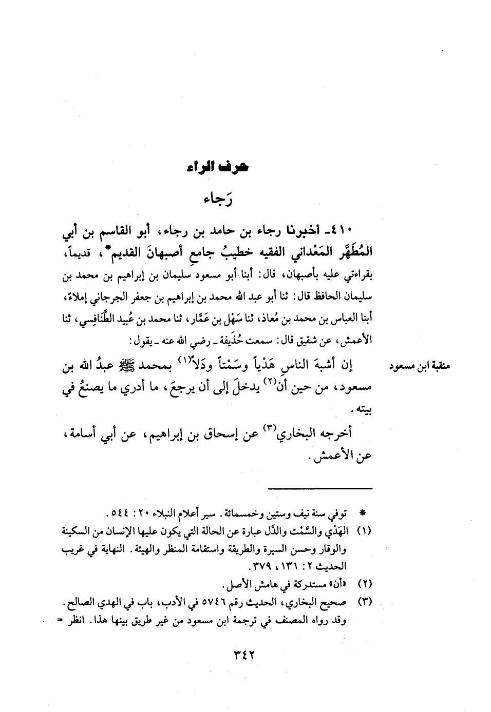 410- أخبرنا رجاء بن حامد بن رجاء أبو القاسم بن أبي المطهر المعداني الفقيه خطيب جامع أصبهان القديم قديما بقراءتي عليه بأصبهان قال أبنا أبو مسعود سليمان بن إبراهيم بن محمد بن سليمان الحافظ قال ثنا أبو عبد الله محمد بن إبراهيم بن جعفر الجرجاني إملاء أبنا العباس بن محمد بن معاذ ثنا سهل بن عمار ثنا محمد بن عبيد الطنافسي ثنا الأعمش عن شقيق قال سمعت حذيفة رضي الله عنه يقول إن أشبه الناس هديا وسمتا ودلا بمحمد صلى الله عليه وسلم عبد الله بن مسعود من حين أن يدخل إلى أن يرجع ما أدري ما يصنع في بيته. أخرجه البخاري عن إسحاق بن إبراهيم عن أبي أسامة عن الأعمش