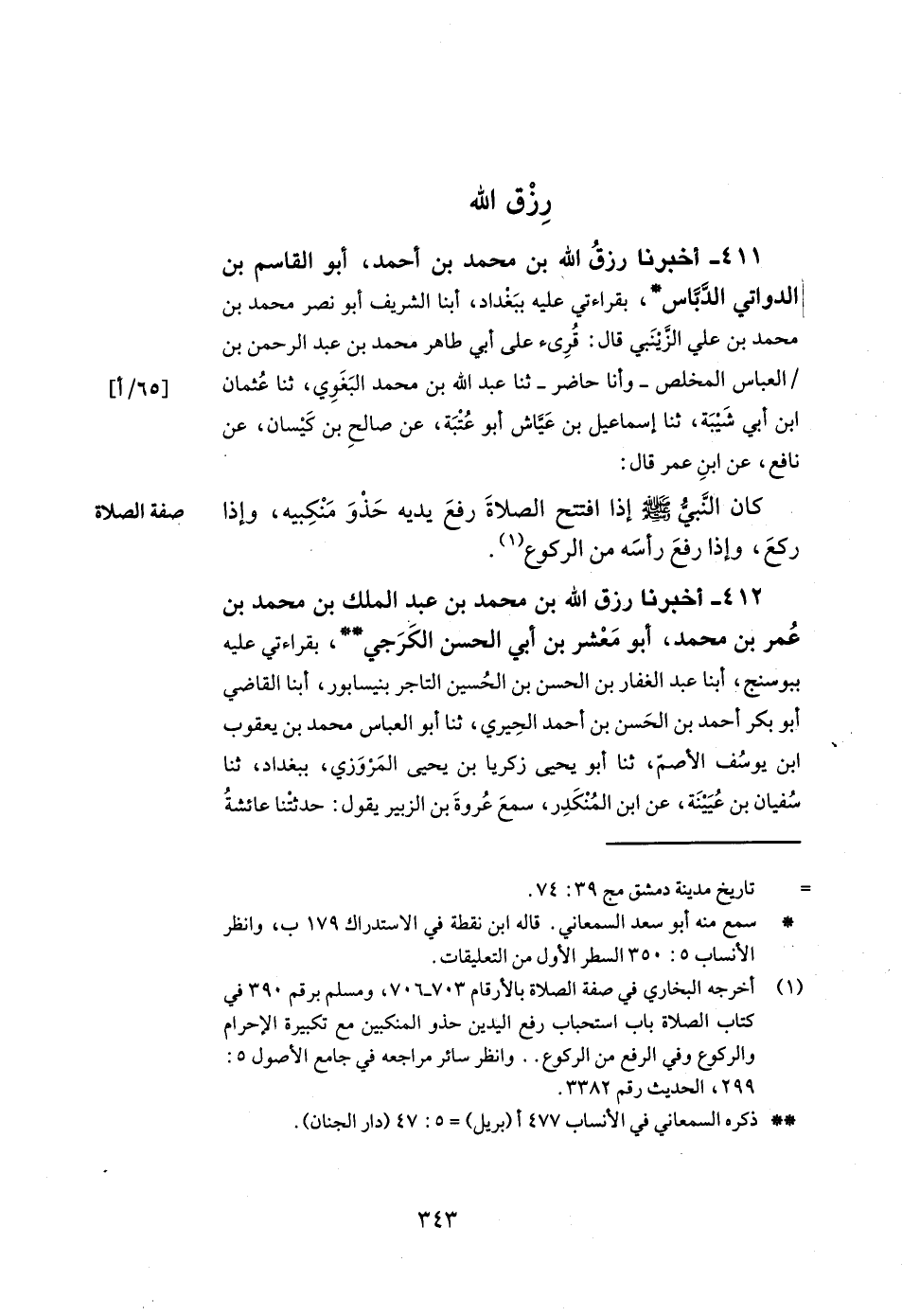 411- أخبرنا رزق الله بن محمد بن أحمد أبو القاسم بن الدواتي الدباس بقراءتي عليه ببغداد أبنا الشريف أبو نصر محمد بن محمد بن علي الزينبي قال قرئ على أبي طاهر محمد بن عبد الرحمن بن العباس المخلص وأنا حاضر ثنا عبد الله بن محمد البغوي ثنا عثمان بن أبي شيبة ثنا إسماعيل بن عياش أبو عتبة عن صالح بن كيسان عن نافع عن ابن عمر قال كان النبي صلى الله عليه وسلم إذا افتتح الصلاة رفع يديه حذو منكبيه وإذا ركع وإذا رفع رأسه من الركوع.