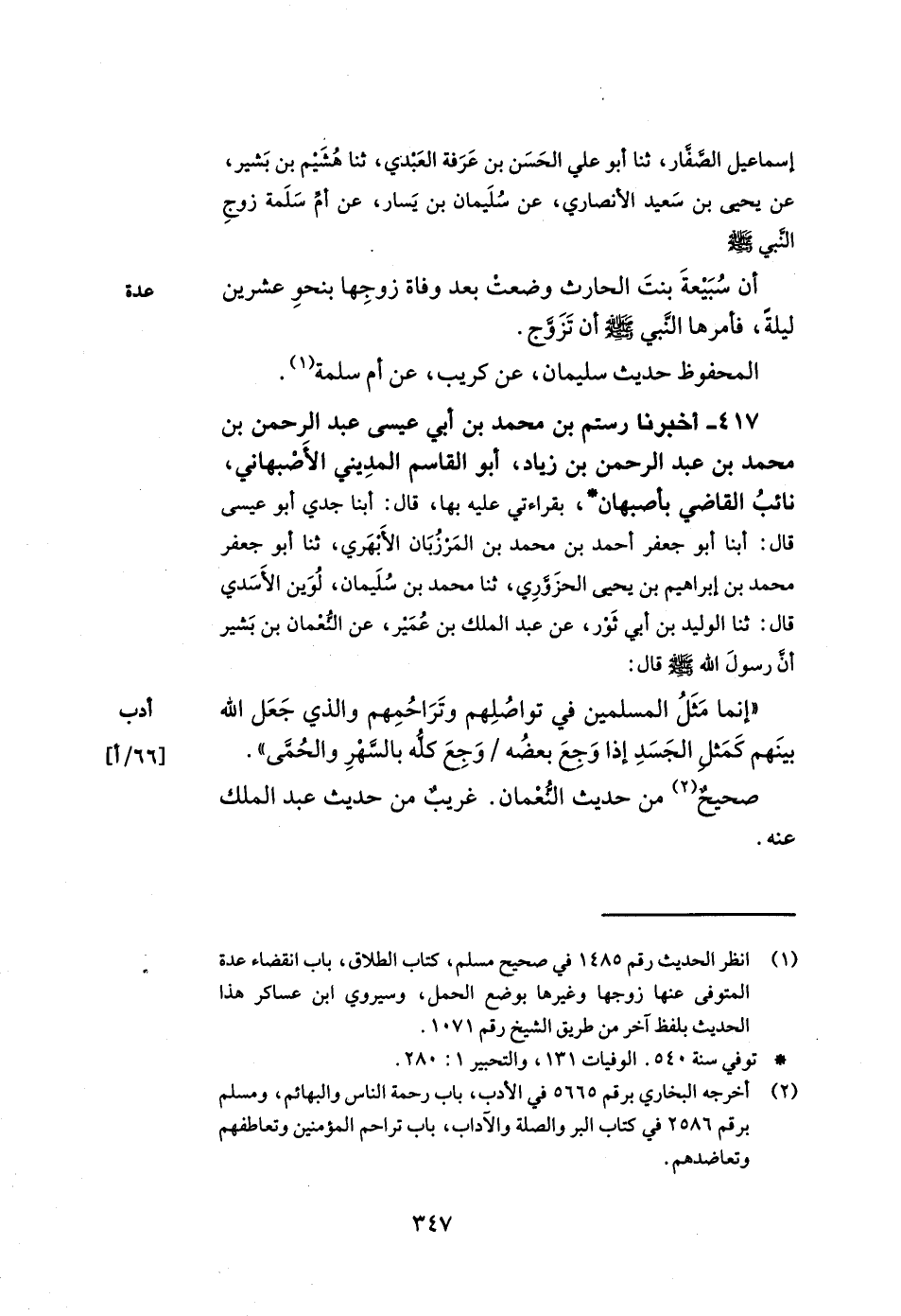 417- أخبرنا رستم بن محمد بن أبي عيسى عبد الرحمن بن محمد بن عبد الرحمن بن زياد أبو القاسم المديني الأصبهاني نائب القاضي بأصبهان بقراءتي عليه بها قال أبنا جدي أبو عيسى قال أبنا أبو جعفر أحمد بن محمد بن المرزبان الأبهري ثنا أبو جعفر محمد بن إبراهيم بن يحيى الحزوري ثنا محمد بن سليمان لوين الأسدي قال ثنا الوليد بن أبي ثور عن عبد الملك بن عمير عن النعمان بن بشير أن رسول الله صلى الله عليه وسلم قال إنما مثل المسلمين في تواصلهم وتراحمهم والذي جعل الله بينهم كمثل الجسد إذا وجع بعضه وجع كله بالسهر والحمى.