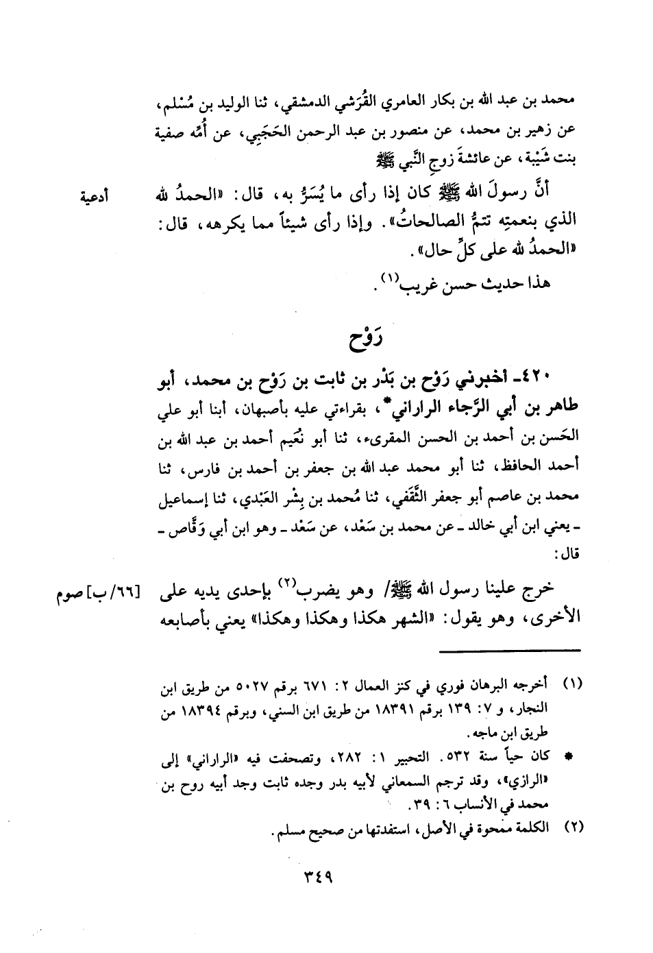 420- أخبرني روح بن بدر بن ثابت بن روح بن محمد أبو طاهر بن أبي الرجاء الراراني بقراءتي عليه بأصبهان أبنا أبو علي الحسن بن أحمد بن الحسن المقرئ ثنا أبو نعيم أحمد بن عبد الله بن أحمد الحافظ ثنا أبو محمد عبد الله بن جعفر بن أحمد بن فارس ثنا محمد بن عاصم أبو جعفر الثقفي ثنا محمد بن بشر العبدي ثنا إسماعيل يعني ابن أبي خالد عن محمد بن سعد عن سعد وهو ابن أبي وقاص قال خرج علينا رسول الله صلى الله عليه وسلم وهو يضرب بإحدى يديه على الأخرى وهو يقول الشهر هكذا وهكذا وهكذا يعني بأصابعه -[350]- العشر ونقص في الثالثة الإبهام وأشار بها محمد.