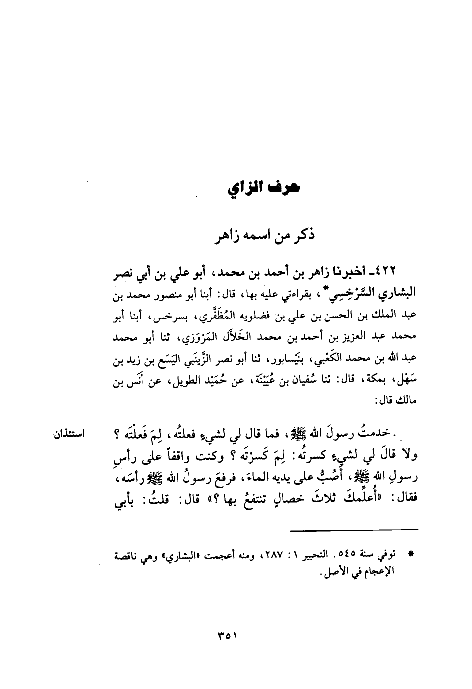 422- أخبرنا زاهر بن أحمد بن محمد أبو علي بن أبي نصر البشاري السرخسي بقراءتي عليه بها قال أبنا أبو منصور محمد بن عبد الملك بن الحسن بن علي بن فضلويه المظفري بسرخس أبنا أبو محمد عبد العزيز بن أحمد بن محمد الخلال المروزي ثنا أبو محمد عبد الله بن محمد الكعبي بنيسابور ثنا أبو نصر الزينبي اليسع بن زيد بن سهل بمكة قال ثنا سفيان بن عيينة عن حميد الطويل عن أنس بن مالك قال خدمت رسول الله صلى الله عليه وسلم فما قال لي لشيء فعلته لم فعلته ولا قال لي لشيء كسرته لم كسرته وكنت واقفا على رأس رسول الله صلى الله عليه وسلم أصب على يديه الماء فرفع رسول الله صلى الله عليه وسلم رأسه فقال: أعلمك ثلاث خصال تنتفع بها. قال قلت بأبي -[352]- وأمي يا رسول الله بلى قال: من لقيت من أمتي فسلم عليه يطل عمرك وإذا دخلت بيتك فسلم عليهم يكثر خير بيتك وصل صلاة الضحى فإنها صلاة الأبرار