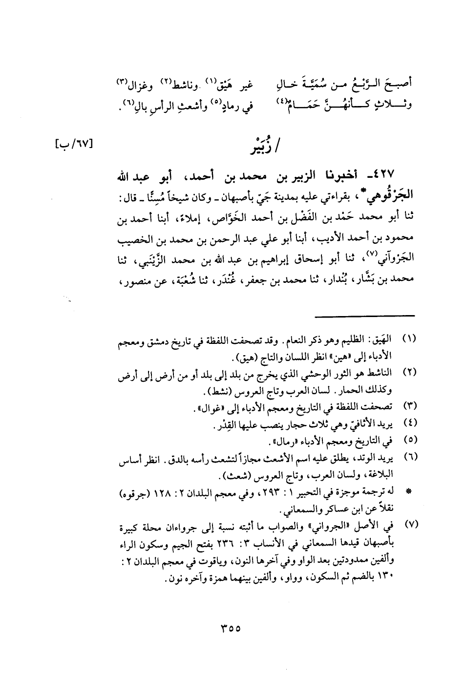 427- أخبرنا الزبير بن محمد بن أحمد أبو عبد الله الجرقوهي بقراءتي عليه بمدينة جي بأصبهان وكان شيخا مسنا قال ثنا أبو محمد حمد بن الفضل بن أحمد الخواص إملاء أبنا أحمد بن محمود بن أحمد الأديب أبنا أبو علي عبد الرحمن بن محمد بن الخصيب الجروآني ثنا أبو إسحاق إبراهيم بن عبد الله بن محمد الزينبي ثنا محمد بن بشار بندار ثنا محمد بن جعفر غندر ثنا شعبة عن منصور -[356]- عن أبي الضحى عن مسروق عن عائشة أن رسول الله صلى الله عليه وسلم كان يقول في ركوعه وسجوده سبحانك اللهم وبحمدك اللهم اغفر لي.