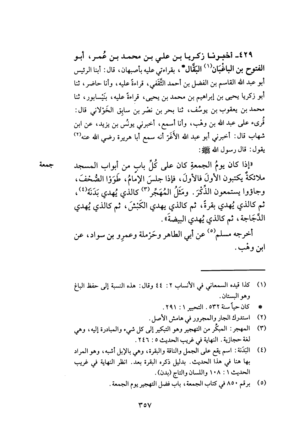 429- أخبرنا زكريا بن علي بن محمد بن عمر أبو الفتوح بن الباغبان البقال بقراءتي عليه بأصبهان قال أبنا الرئيس أبو عبد الله القاسم بن الفضل بن أحمد الثقفي قراءة عليه وأنا حاضر ثنا أبو زكريا يحيى بن إبراهيم بن محمد بن يحيى قراءة عليه بنيسابور ثنا محمد بن يعقوب بن يوسف ثنا بحر بن نصر بن سابق الخولاني قال قرئ على عبد الله بن وهب وأنا أسمع أخبرني يونس بن يزيد عن ابن شهاب قال أخبرني أبو عبد الله الأغر أنه سمع أبا هريرة رضي الله عنه يقول قال رسول الله صلى الله عليه وسلم إذا كان يوم الجمعة كان على كل باب من أبواب المسجد ملائكة يكتبون الأول فالأول فإذا جلس الإمام طووا الصحف وجاؤوا يستمعون الذكر ومثل المهجر كالذي يهدي بدنة ثم كالذي يهدي بقرة ثم كالذي يهدي الكبش ثم كالذي يهدي الدجاجة ثم كالذي يهدي البيضة.