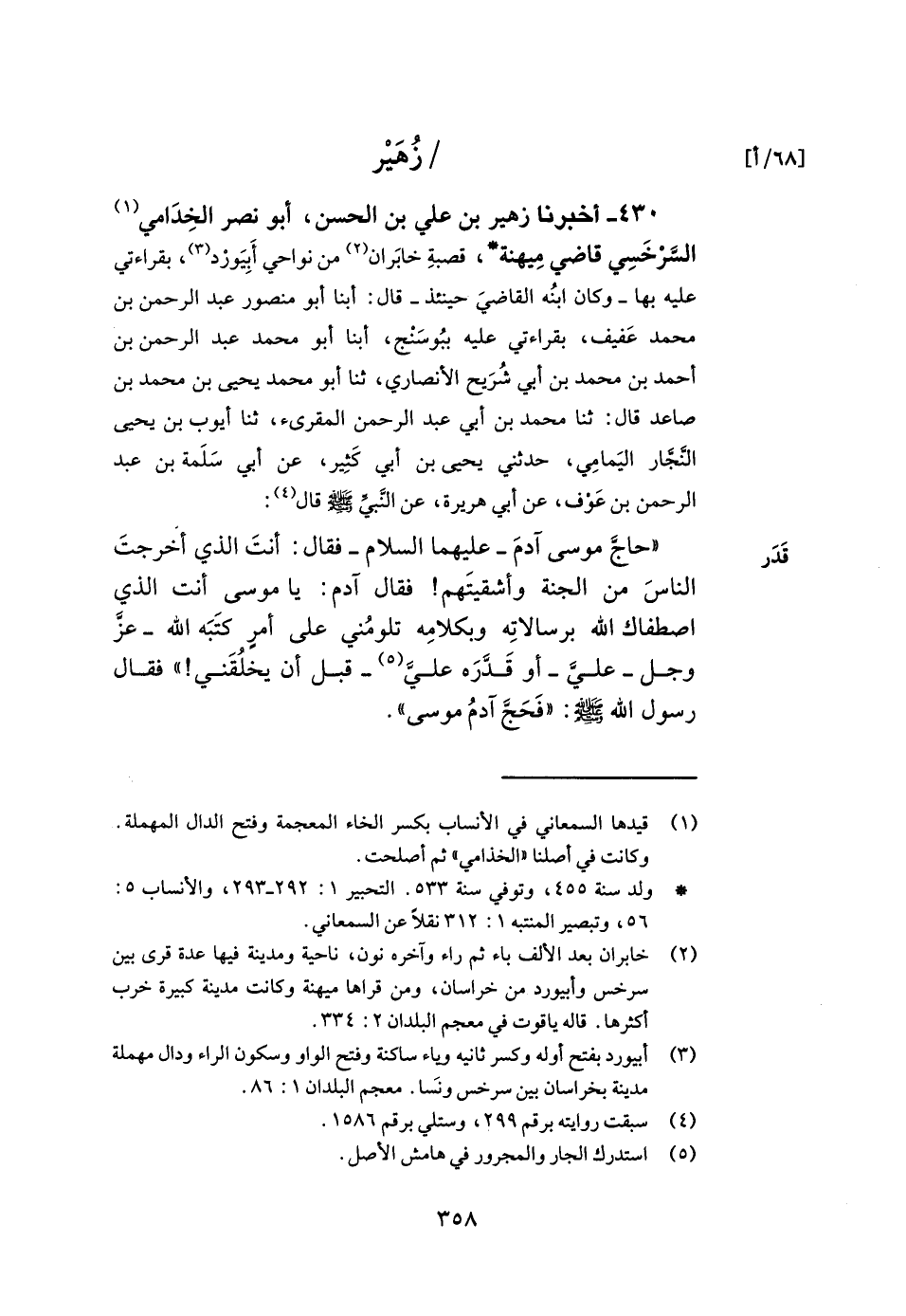 430- أخبرنا زهير بن علي بن الحسن أبو نصر الخدامي السرخسي قاضي ميهنة قصبة خابران من نواحي أبيورد بقراءتي عليه بها وكان ابنه القاضي حينئذ قال أبنا أبو منصور عبد الرحمن بن محمد عفيف بقراءتي عليه ببوسنج أبنا أبو محمد عبد الرحمن بن أحمد بن محمد بن أبي شريح الأنصاري ثنا أبو محمد يحيى بن محمد بن صاعد قال ثنا محمد بن أبي عبد الرحمن المقرئ ثنا أيوب بن يحيى النجار اليمامي حدثني يحيى بن أبي كثير عن أبي سلمة بن عبد الرحمن بن عوف عن أبي هريرة عن النبي صلى الله عليه وسلم قال حاج موسى آدم عليهما السلام فقال أنت الذي أخرجت الناس من الجنة وأشقيتهم فقال آدم يا موسى أنت الذي اصطفاك الله برسالاته وبكلامه تلومني على أمر كتبه الله عز وجل علي أو قدره علي قبل أن يخلقني فقال رسول الله صلى الله عليه وسلم فحج آدم موسى.