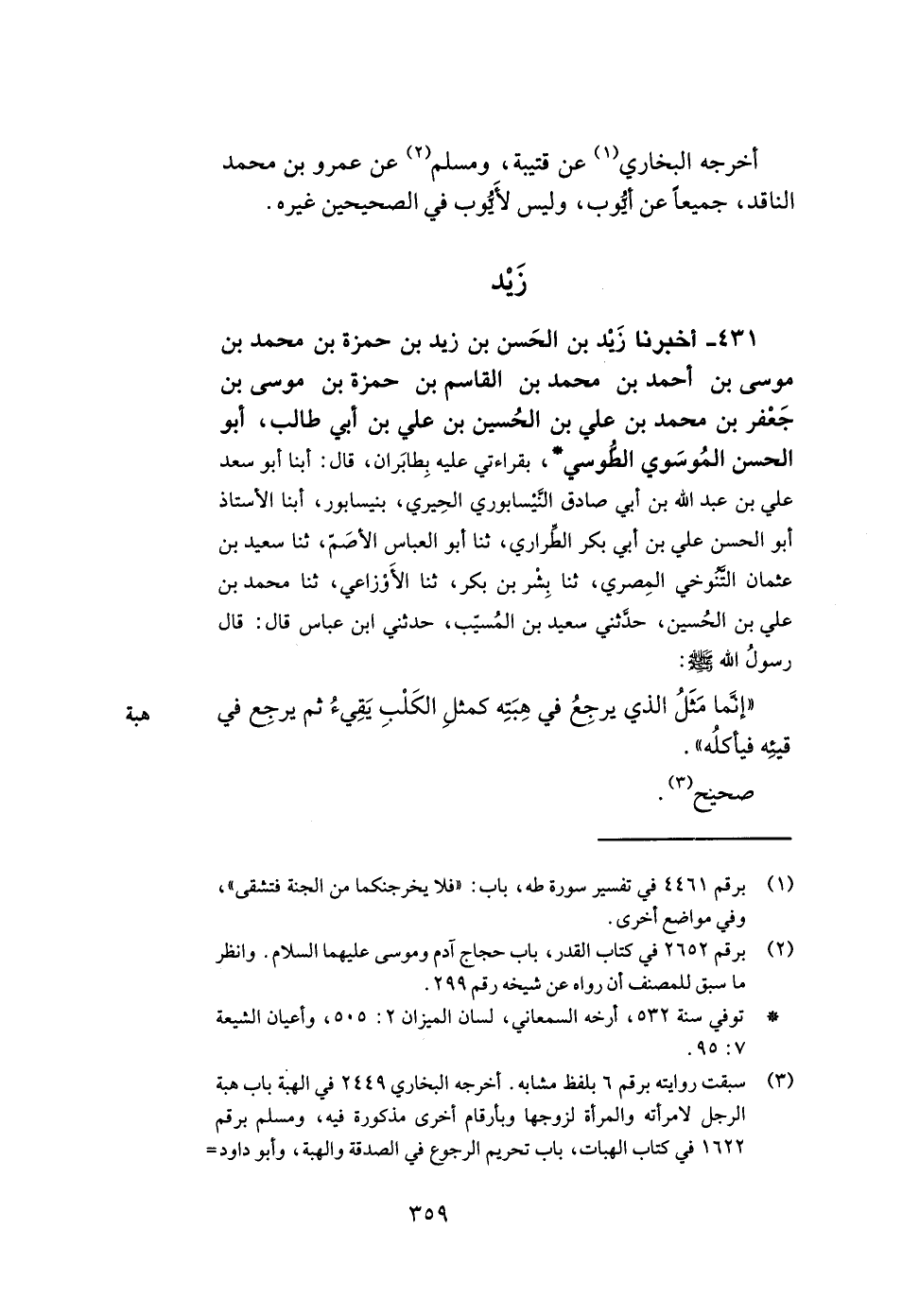 431- أخبرنا زيد بن الحسن بن زيد بن حمزة بن محمد بن موسى بن أحمد بن محمد بن القاسم بن حمزة بن موسى بن جعفر بن محمد بن علي بن الحسين بن علي بن أبي طالب أبو الحسن الموسوي الطوسي بقراءتي عليه بطابران قال أبنا أبو سعد علي بن عبد الله بن أبي صادق النيسابوري الحيري بنيسابور أبنا الأستاذ أبو الحسن علي بن أبي بكر الطراري ثنا أبو العباس الأصم ثنا سعيد بن عثمان التنوخي المصري ثنا بشر بن بكر ثنا الأوزاعي ثنا محمد بن علي بن الحسين حدثني سعيد بن المسيب حدثني ابن عباس قال قال رسول الله صلى الله عليه وسلم إنما مثل الذي يرجع في هبته كمثل الكلب يقيء ثم يرجع في قيئه فيأكله.