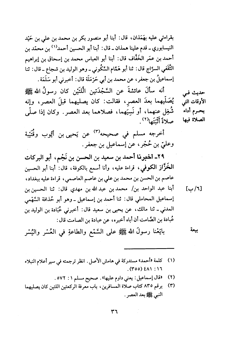 29- أخبرنا أحمد بن سعيد بن الحسن بن نجم أبو البركات الخزاز الكوفي قراءة عليه وأنا أسمع بالكوفة قال أبنا أبو الحسين عاصم بن الحسن بن محمد بن علي بن عاصم العاصمي قراءة عليه ببغداد أبنا عبد الواحد بن محمد بن عبد الله بن مهدي قال ثنا الحسين بن إسماعيل المحاملي قال ثنا أحمد بن إسماعيل وهو أبو حذافة السهمي المدني ثنا مالك عن يحيى بن سعيد قال أخبرني عبادة بن الوليد بن عبادة بن الصامت أن أباه أخبره عن عبادة بن الصامت قال بايعنا رسول الله صلى الله عليه وسلم على السمع والطاعة في العسر واليسر -[37]- والمنشط والمكره وأن لا ننازع الأمر أهله وأن نقول أو نقوم بالحق حيثما كنا لا نخاف في الله لومة لائم.