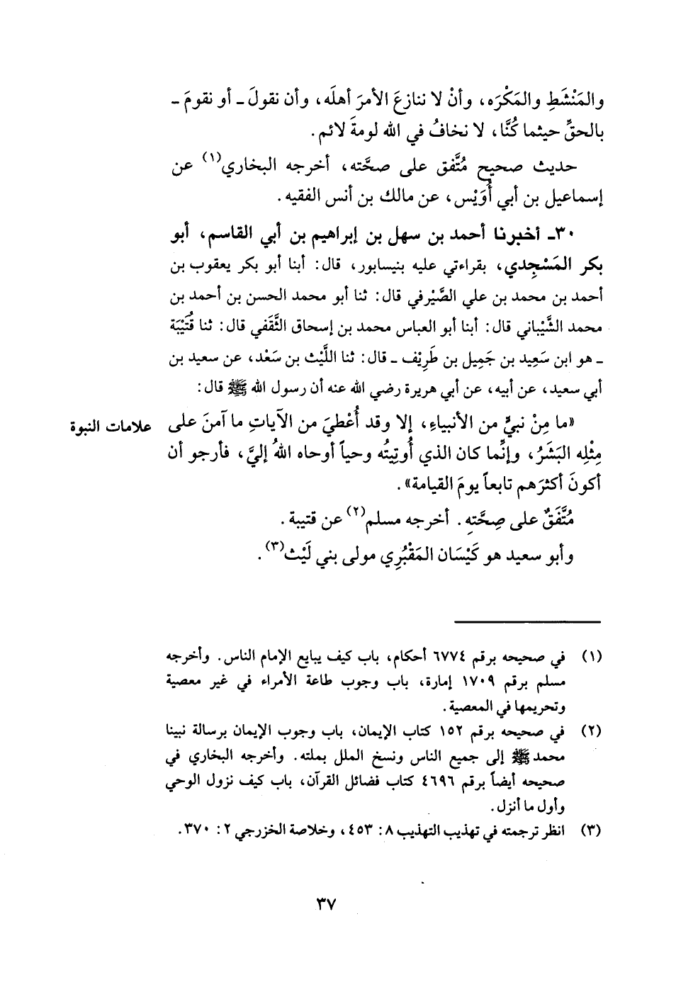 30- أخبرنا أحمد بن سهل بن إبراهيم بن أبي القاسم أبو بكر المسجدي بقراءتي عليه بنيسابور قال أبنا أبو بكر يعقوب بن أحمد بن محمد بن علي الصيرفي قال ثنا أبو محمد الحسن بن أحمد بن محمد الشيباني قال أبنا أبو العباس محمد بن إسحاق الثقفي قال ثنا قتيبة هو ابن سعيد بن جميل بن طريف قال ثنا الليث بن سعد عن سعيد بن أبي سعيد عن أبيه عن أبي هريرة رضي الله عنه أن رسول الله صلى الله عليه وسلم قال ما من نبي من الأنبياء إلا وقد أعطي من الآيات ما آمن على مثله البشر وإنما كان الذي أوتيته وحيا أوحاه الله إلي فأرجو أن أكون أكثرهم تابعا يوم القيامة.