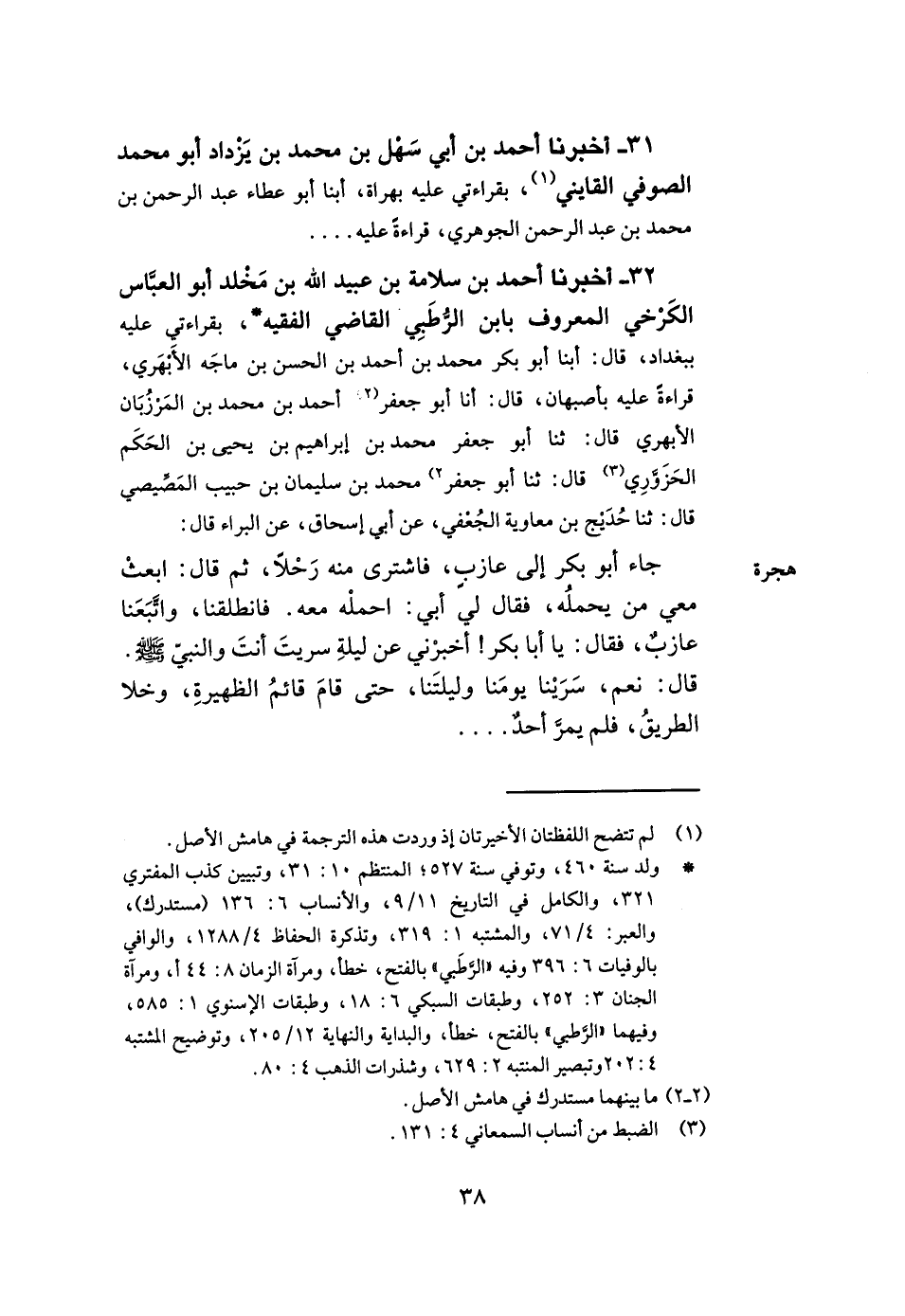 32- أخبرنا أحمد بن سلامة بن عبيد الله بن مخلد أبو العباس الكرخي المعروف بابن الرطبي القاضي الفقيه بقراءتي عليه ببغداد قال أبنا أبو بكر محمد بن أحمد بن الحسن بن ماجه الأبهري قراءة عليه بأصبهان قال أنا أبو جعفر أحمد بن محمد بن المرزبان الأبهري قال ثنا أبو جعفر محمد بن إبراهيم بن يحيى بن الحكم الحزوري قال ثنا أبو جعفر محمد بن سليمان بن حبيب المصيصي قال ثنا حديج بن معاوية الجعفي عن أبي إسحاق عن البراء قال جاء أبو بكر إلى عازب فاشترى منه رحلا ثم قال ابعث معي من يحمله فقال لي أبي احمله معه فانطلقنا واتبعنا عازب فقال يا أبا بكر أخبرني عن ليلة سريت أنت والنبي صلى الله عليه وسلم قال نعم سرينا يومنا وليلتنا حتى قام قائم الظهيرة وخلا الطريق فلم يمر أحد.. .. -[39]- وذكر الحديث بطوله