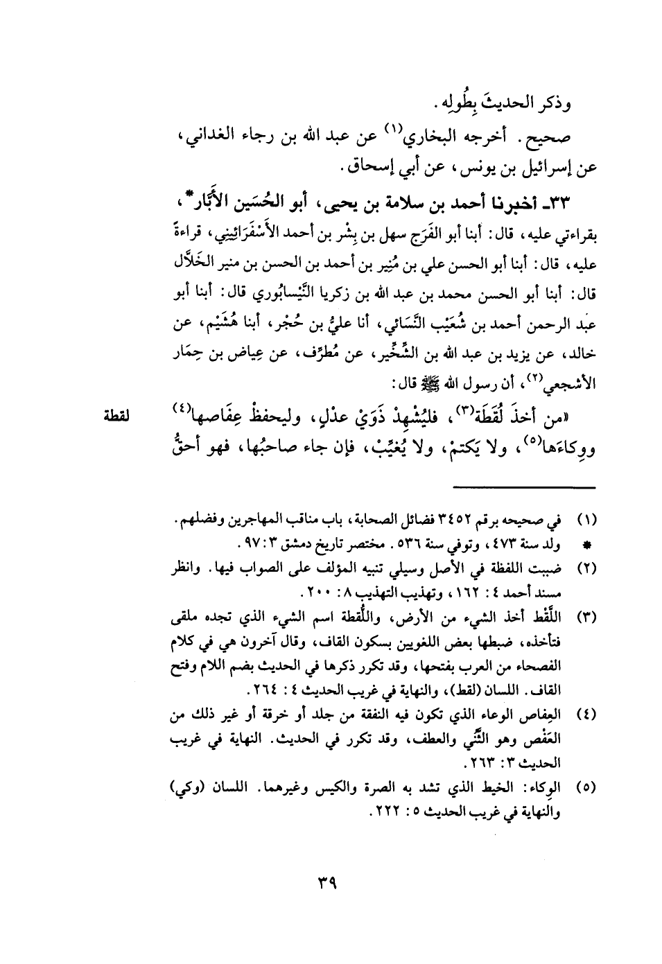 33- أخبرنا أحمد بن سلامة بن يحيى أبو الحسين الأبار بقراءتي عليه قال أبنا أبو الفرج سهل بن بشر بن أحمد الأسفرائيني قراءة عليه قال أبنا أبو الحسن علي بن منير بن أحمد بن الحسن بن منير الخلال قال أبنا أبو الحسن محمد بن عبد الله بن زكريا النيسابوري قال أبنا أبو عبد الرحمن أحمد بن شعيب النسائي أنا علي بن حجر أبنا هشيم عن خالد عن يزيد بن عبد الله بن الشخير عن مطرف عن عياض بن حمار الأشجعي أن رسول الله صلى الله عليه وسلم قال من أخذ لقطة فليشهد ذوي عدل وليحفظ عفاصها ووكاءها ولا يكتم ولا يغيب فإن جاء صاحبها فهو أحق -[40]- بها وإن لم يجئ صاحبها فهو مال الله عز وجل يؤتيه من يشاء. هكذا وقع في هذه الرواية وصوابه المجاشعي وقد أخبرناه عاليا على الصواب أبو عبد الله الحسين بن عبد الملك بن الحسين الأديب وأم مجتبى فاطمة بنت ناصر بن الحسن العلوية بقراءتي عليهما بأصبهان قالا أبنا إبراهيم بن منصور بن إبراهيم الخباز قال أبنا محمد بن إبراهيم بن علي بن المقرئ أبنا أبو يعلى أحمد بن علي بن المثنى قال ثنا زكريا يعني ابن يحيى الواسطي زحمويه ثنا هشيم عن خالد عن يزيد بن عبد الله بن الشخير عن أخيه مطرف عن عياض بن حمار المجاشعي قال قال رسول الله صلى الله عليه وسلم من وجد لقطة فليحفظ عفاصها ووكاءها ولا يكتم ولا يغير فإن جاء صاحبها فهو أحق بها وإلا فإنما هو مال الله يؤتيه من يشاء.