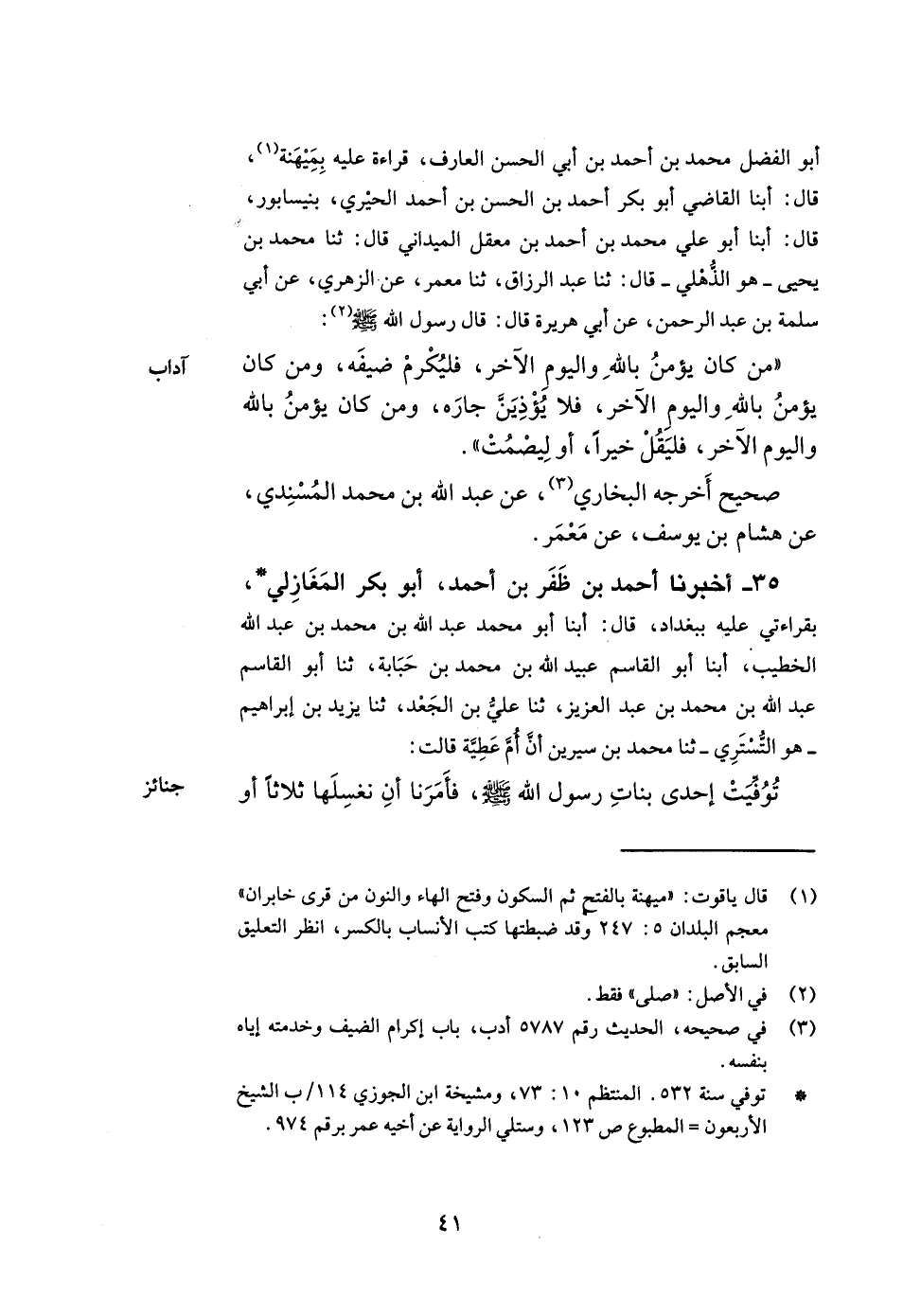 35- أخبرنا أحمد بن ظفر بن أحمد أبو بكر المغازلي بقراءتي عليه ببغداد قال أبنا أبو محمد عبد الله بن محمد بن عبد الله الخطيب أبنا أبو القاسم عبيد الله بن محمد بن حبابة ثنا أبو القاسم عبد الله بن محمد بن عبد العزيز ثنا علي بن الجعد ثنا يزيد بن إبراهيم هو التستري ثنا محمد بن سيرين أن أم عطية قالت توفيت إحدى بنات رسول الله صلى الله عليه وسلم فأمرنا أن نغسلها ثلاثا أو -[42]- خمسا أو أكثر من ذلك إن رأيتن وأن نجعل في الغسلة الآخرة شيئا من سدر وكافور.