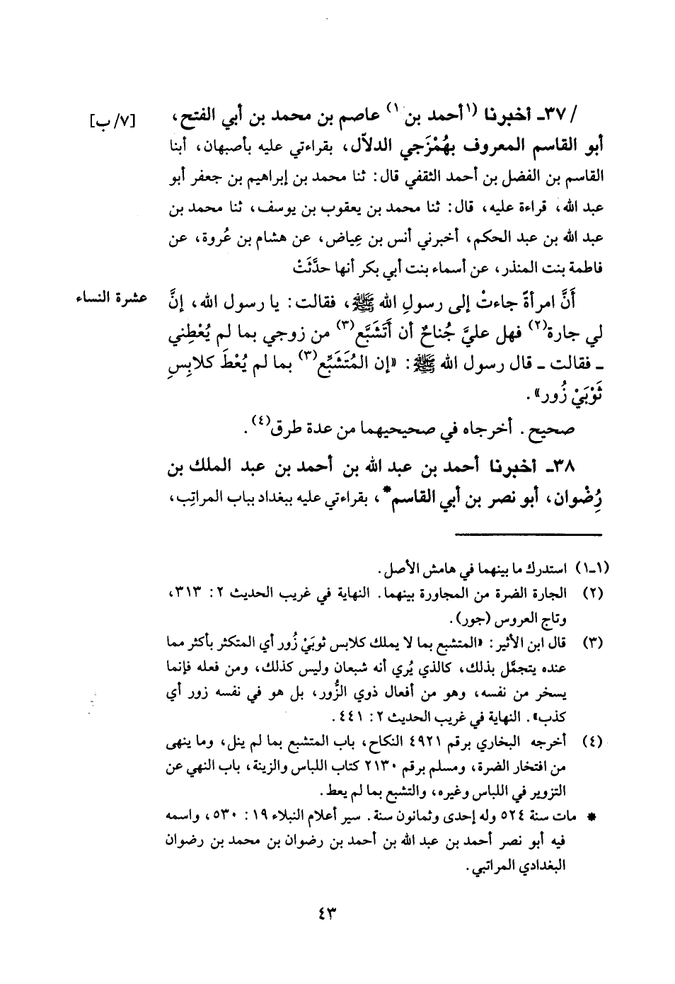 37- أخبرنا أحمد بن عاصم بن محمد بن أبي الفتح أبو القاسم المعروف بهمزجي الدلال بقراءتي عليه بأصبهان أبنا القاسم بن الفضل بن أحمد الثقفي قال ثنا محمد بن إبراهيم بن جعفر أبو عبد الله قراءة عليه قال ثنا محمد بن يعقوب بن يوسف ثنا محمد بن عبد الله بن عبد الحكم أخبرني أنس بن عياض عن هشام بن عروة عن فاطمة بنت المنذر عن أسماء بنت أبي بكر أنها حدثت أن امرأة جاءت إلى رسول الله صلى الله عليه وسلم فقالت يا رسول الله إن لي جارة فهل علي جناح أن أتشبع من زوجي بما لم يعطني فقالت قال رسول الله صلى الله عليه وسلم إن المتشبع بما لم يعط كلابس ثوبي زور.