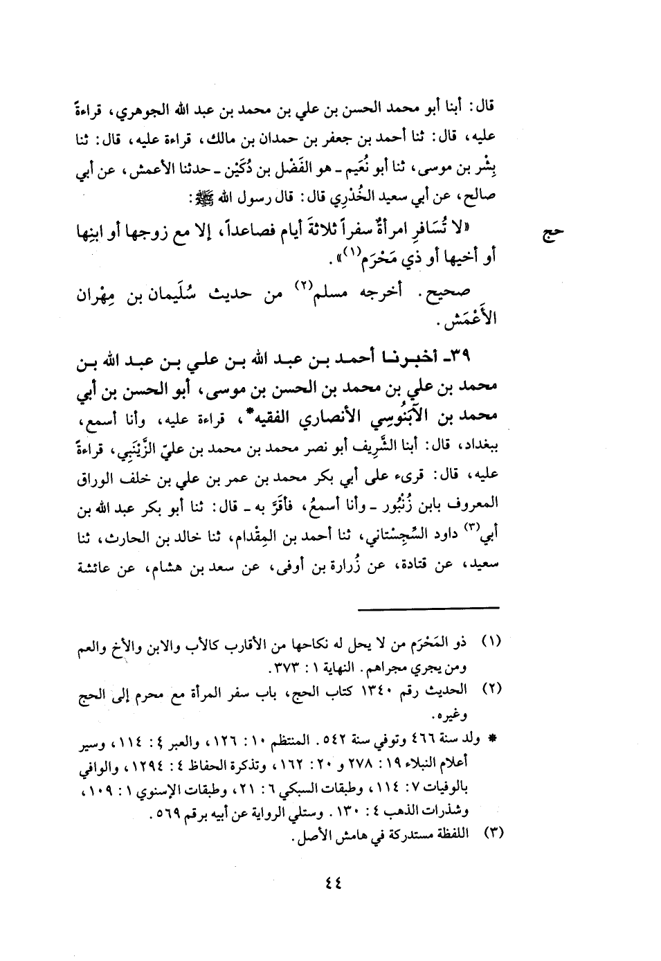 39- أخبرنا أحمد بن عبد الله بن علي بن عبد الله بن محمد بن علي بن محمد بن الحسن بن موسى أبو الحسن بن أبي محمد بن الآبنوسي الأنصاري الفقيه قراءة عليه وأنا أسمع ببغداد قال أبنا الشريف أبو نصر محمد بن محمد بن علي الزينبي قراءة عليه قال قرئ على أبي بكر محمد بن عمر بن علي بن خلف الوراق المعروف بابن زنبور وأنا أسمع فأقر به قال ثنا أبو بكر عبد الله بن أبي داود السجستاني ثنا أحمد بن المقدام ثنا خالد بن الحارث ثنا سعيد عن قتادة عن زرارة بن أوفى عن سعد بن هشام عن عائشة -[45]- رضي الله عنها أن رسول الله صلى الله عليه وسلم قال من أحب لقاء الله أحب الله لقاءه ومن كره لقاء الله كره الله لقاءه قلت يا نبي الله أكراهية الموت قال إن المؤمن إذا حضره الموت بشر برحمة الله ورضوانه وجنته فأحب لقاء الله وأحب الله لقاءه وأما الكافر إذا حضره الموت بشر بعذاب الله وسخطه فكره لقاء الله فكره الله لقاءه.