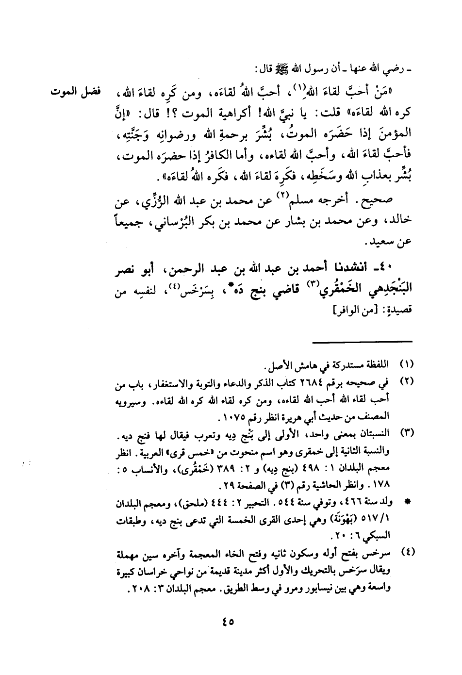 40- أنشدنا أحمد بن عبد الله بن عبد الرحمن أبو نصر البنجدهي الخمقري قاضي بنج ده بسرخس لنفسه من قصيدة -[46]-