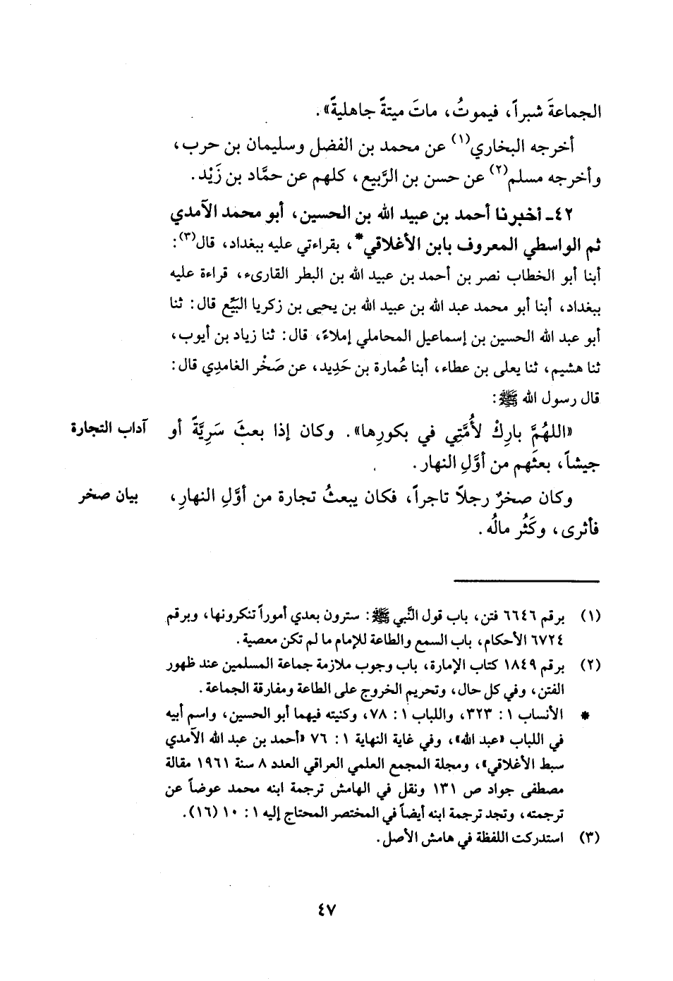 42- أخبرنا أحمد بن عبيد الله بن الحسين أبو محمد الآمدي ثم الواسطي المعروف بابن الأغلاقي بقراءتي عليه ببغداد قال أبنا أبو الخطاب نصر بن أحمد بن عبيد الله بن البطر القارئ قراءة عليه ببغداد أبنا أبو محمد عبد الله بن عبيد الله بن يحيى بن زكريا البيع قال ثنا أبو عبد الله الحسين بن إسماعيل المحاملي إملاء قال ثنا زياد بن أيوب ثنا هشيم ثنا يعلى بن عطاء أبنا عمارة بن حديد عن صخر الغامدي قال قال رسول الله صلى الله عليه وسلم اللهم بارك لأمتي في بكورها وكان إذا بعث سرية أو جيشا بعثهم من أول النهار وكان صخر رجلا تاجرا فكان يبعث تجارة من أول النهار فأثرى وكثر ماله.