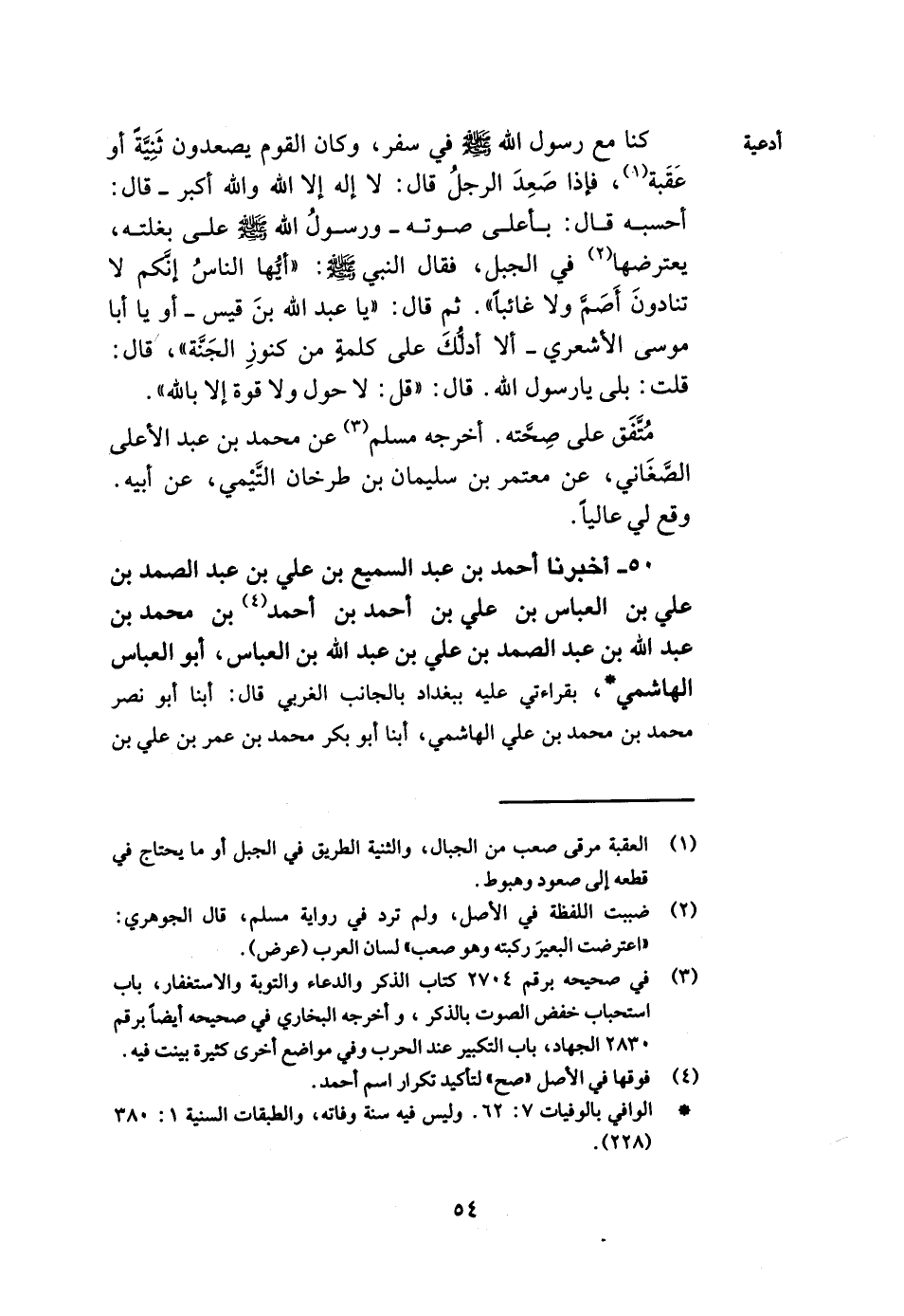 50- أخبرنا أحمد بن عبد السميع بن علي بن عبد الصمد بن علي بن العباس بن علي بن أحمد بن أحمد بن محمد بن عبد الله بن عبد الصمد بن علي بن عبد الله بن العباس أبو العباس الهاشمي بقراءتي عليه ببغداد بالجانب الغربي قال أبنا أبو نصر محمد بن محمد بن علي الهاشمي أبنا أبو بكر محمد بن عمر بن علي بن -[55]- خلف الوراق حدثنا عبد الله بن أبي داود السجستاني ثنا محمد بن منصور الطوسي ومحمد بن عبد الرحيم بن أبي زهير أن روح بن عبادة أخبرهم عن ابن عيينة عن عمار الدهني عن عطية عن أبي سعيد الخدري قال قال رسول الله صلى الله عليه وسلم كيف أنعم وصاحب الصور ينتظر متى يؤمر أن ينفخ فينفخ قالوا وماذا نقول يا رسول الله قال قولوا حسبنا الله ونعم الوكيل.