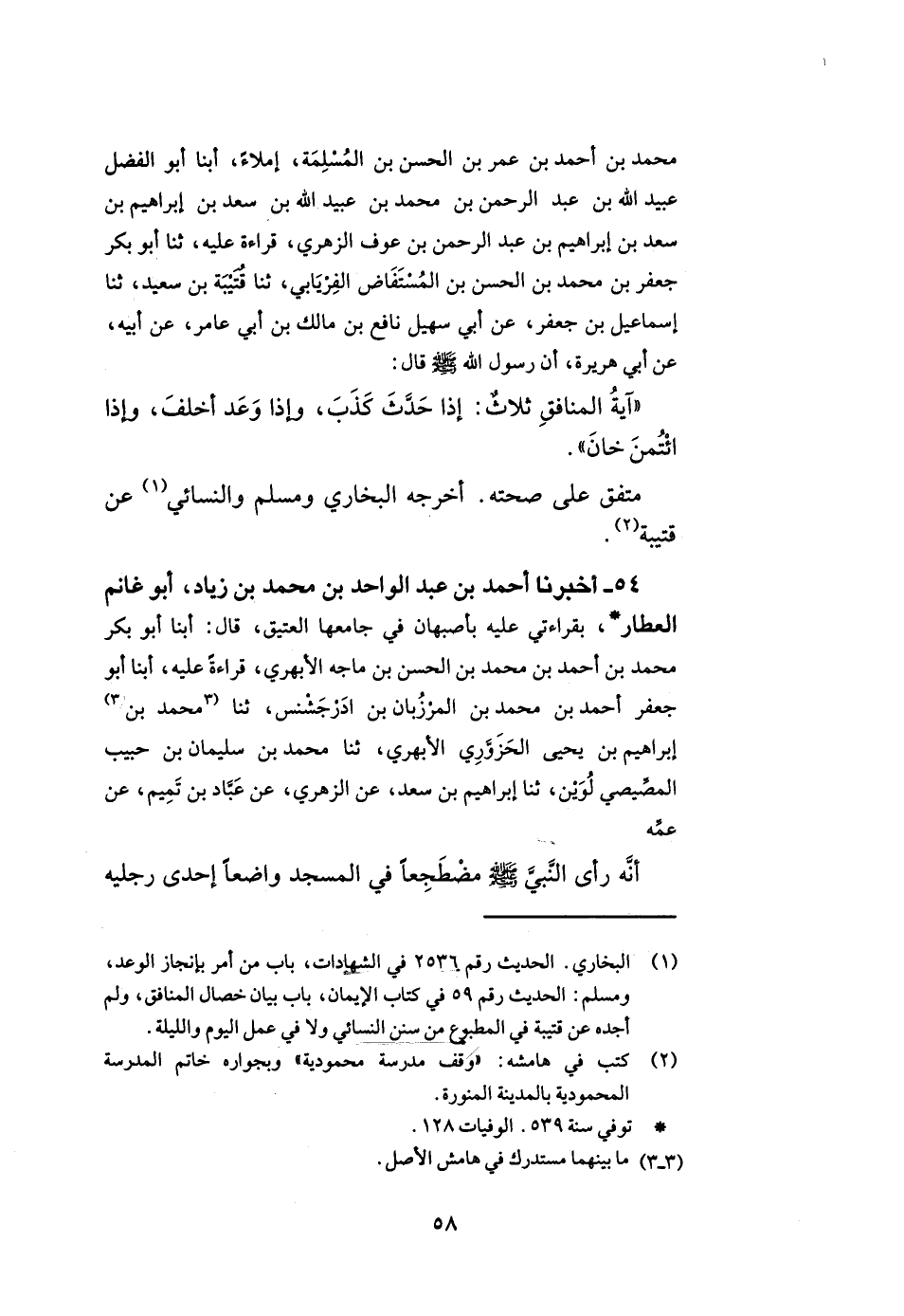 54- أخبرنا أحمد بن عبد الواحد بن محمد بن زياد أبو غانم العطار بقراءتي عليه بأصبهان في جامعها العتيق قال أبنا أبو بكر محمد بن أحمد بن محمد بن الحسن بن ماجه الأبهري قراءة عليه أبنا أبو جعفر أحمد بن محمد بن المرزبان بن ادرجشنس ثنا محمد بن إبراهيم بن يحيى الحزوري الأبهري ثنا محمد بن سليمان بن حبيب المصيصي لوين ثنا إبراهيم بن سعد عن الزهري عن عباد بن تميم عن عمه أنه رأى النبي صلى الله عليه وسلم مضطجعا في المسجد واضعا إحدى رجليه -[59]- على الأخرى وأن أبا بكر وعمر وعثمان كانوا يفعلوا ذلك.